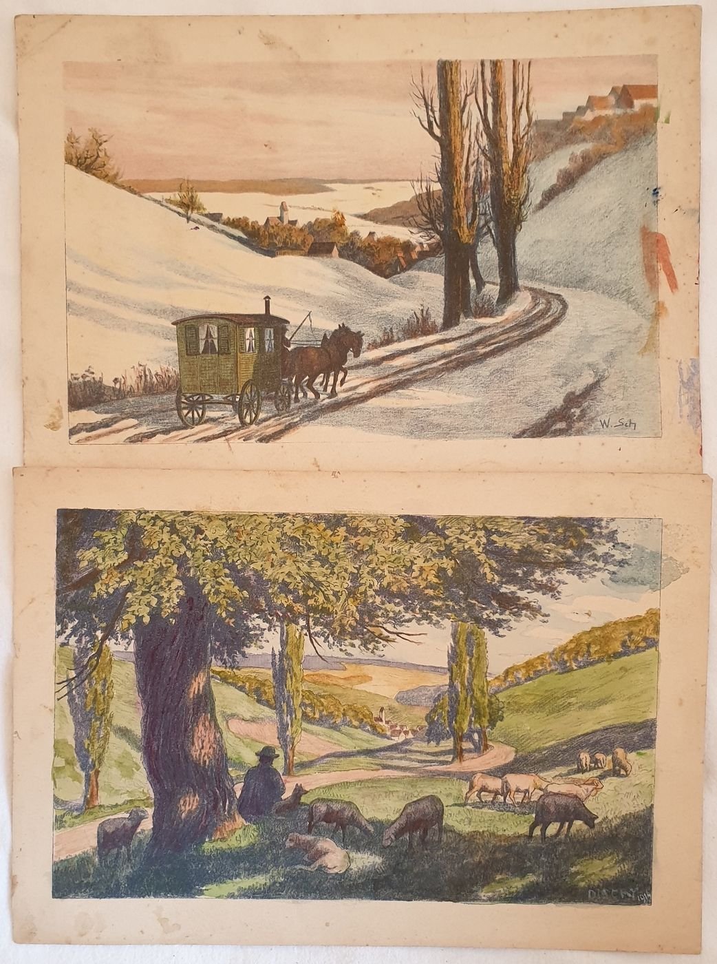 Raccota di due incisioni dipinte a mano all'acquarello che rappresentano due scene bucoliche. Uno datato 1914, l'altro dei primi del novecento. In buone condizioni. Dim. cm 20x28,5Lot of two engravings coloured with watercolour painting representing bucolic scenes. one is dated 1914, the other one early 20th century. In good conditions. Dim. cm 20x28,5
