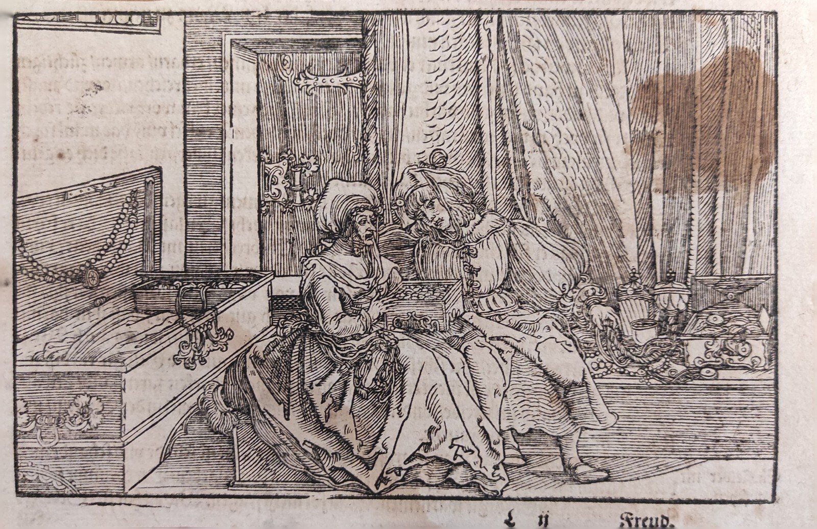 Hans Weiditz è considerato uno dei maestri della xilografia rinascimentale tedesca, insieme a Holbein, Burgkmair e naturalmente Albrecht Dürer. Viene indicato come "Il Maestro Petrarca" in ragione delle oltre 250 illustrazioni xilografiche da lui realizzate per il De Remediis Utriusque Fortunae di Petrarca.Quella qui proposta è una delle incisioni appartenenti a questa suggestiva raccolta. xilografia cm. 11 x 17 Buono (Good) Buon es., gora in basso a sinistra.