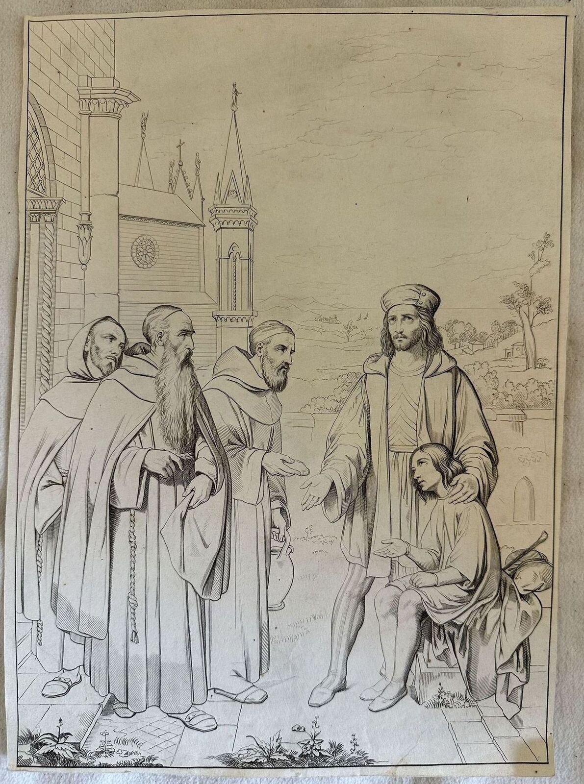 Bella acquaforte che mostra una scena religiosa. Data: 1850 circa Tecnica: acquaforte Dimensione del foglio: 25x28,3 cm Dimensione dell'incisione: 24x27,5 cm Condizioni: Buone. Alcune fioriture. Piegatura verticale e restauro al versoNice etching showing the religious scene "The Ascension" Date: 1850 circa Technique: etching Size of the page: 25x28,3 cm Size of the engraving: 24x27,5 cm Conditions: Good conditions. Some foxing<BR><BR>