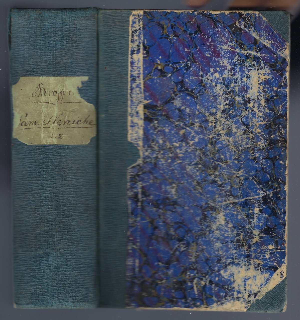Cartonato editoriale marmorato piuttosto consunto, con titoli su etichetta al dorso.