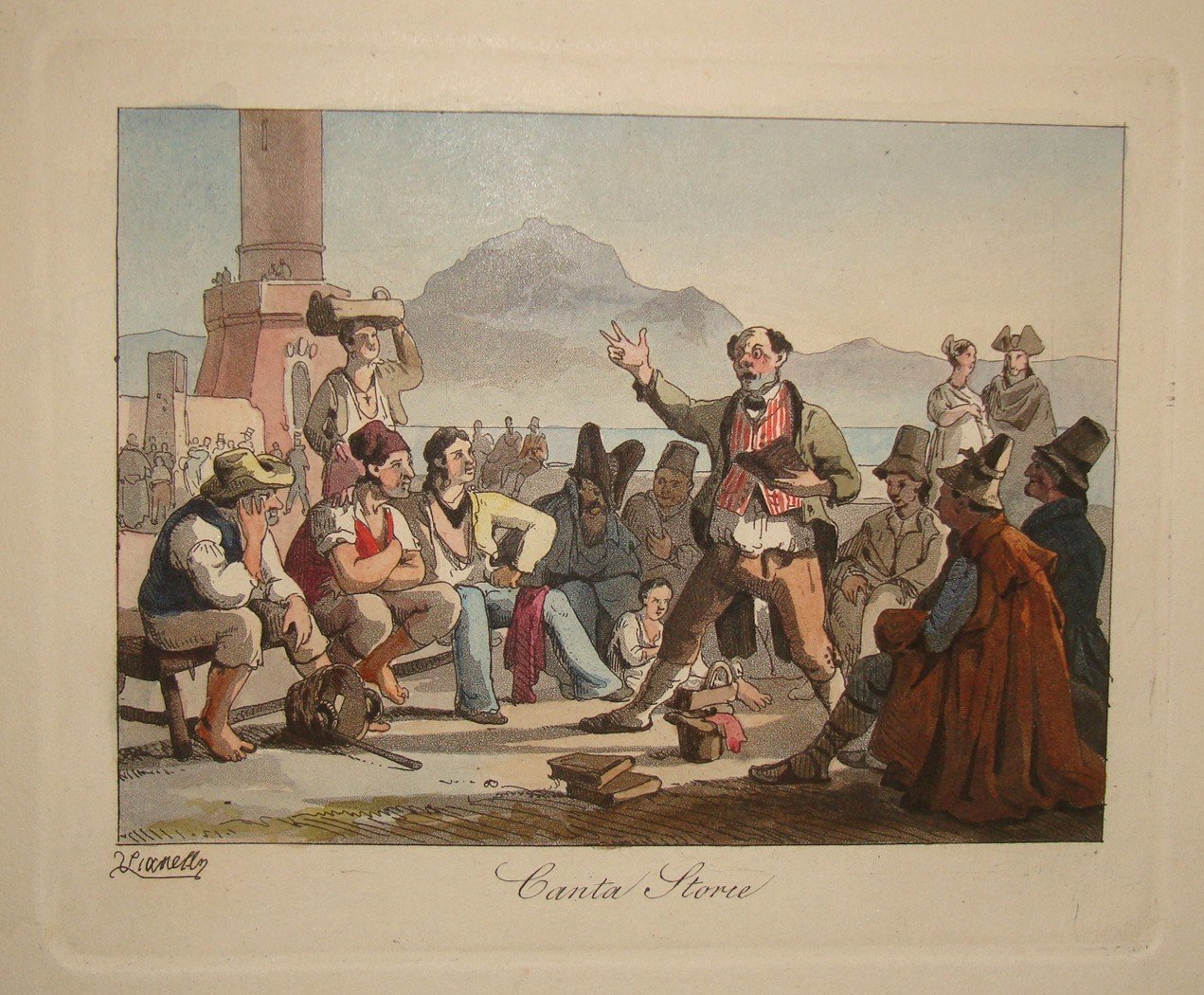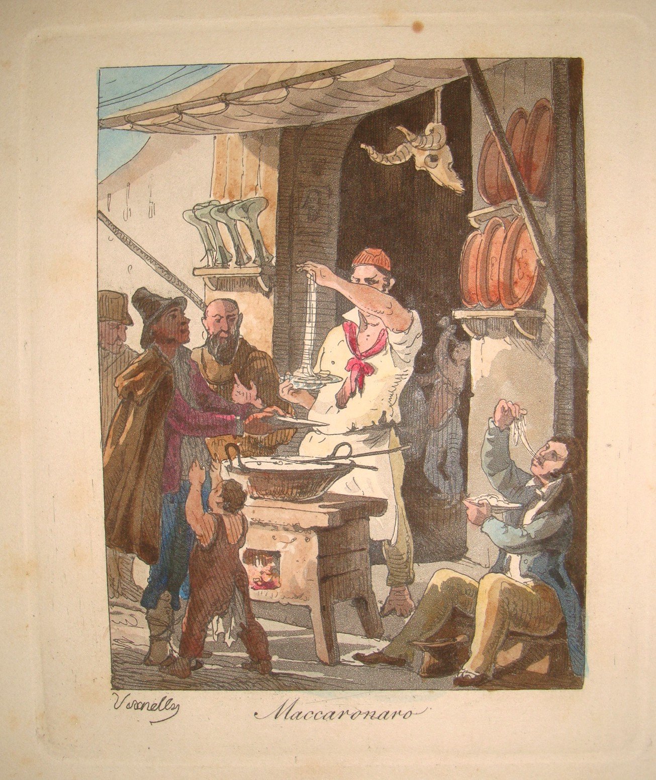 Ciascuna tavola cm.10x12 oltre i margini, con il titolo e la firma in lastra Vianelly. 1830 ca. Ritorno dalla Festa della Madonna dell’Arco; Calesso da viaggio; Fabbricante di Franfellicchi; Maccaronaro; Acquajuolo; Acquajuolo ambulante; Canta Storie; Levatrice col bambino; Lotto; Esequie; Predicatore; Orfanelli cantanti; Questuante per S.Antonio; Rissa di donne. Album in 8vo oblungo, cm.19x23. Legatura in cart. coevo. Raro.