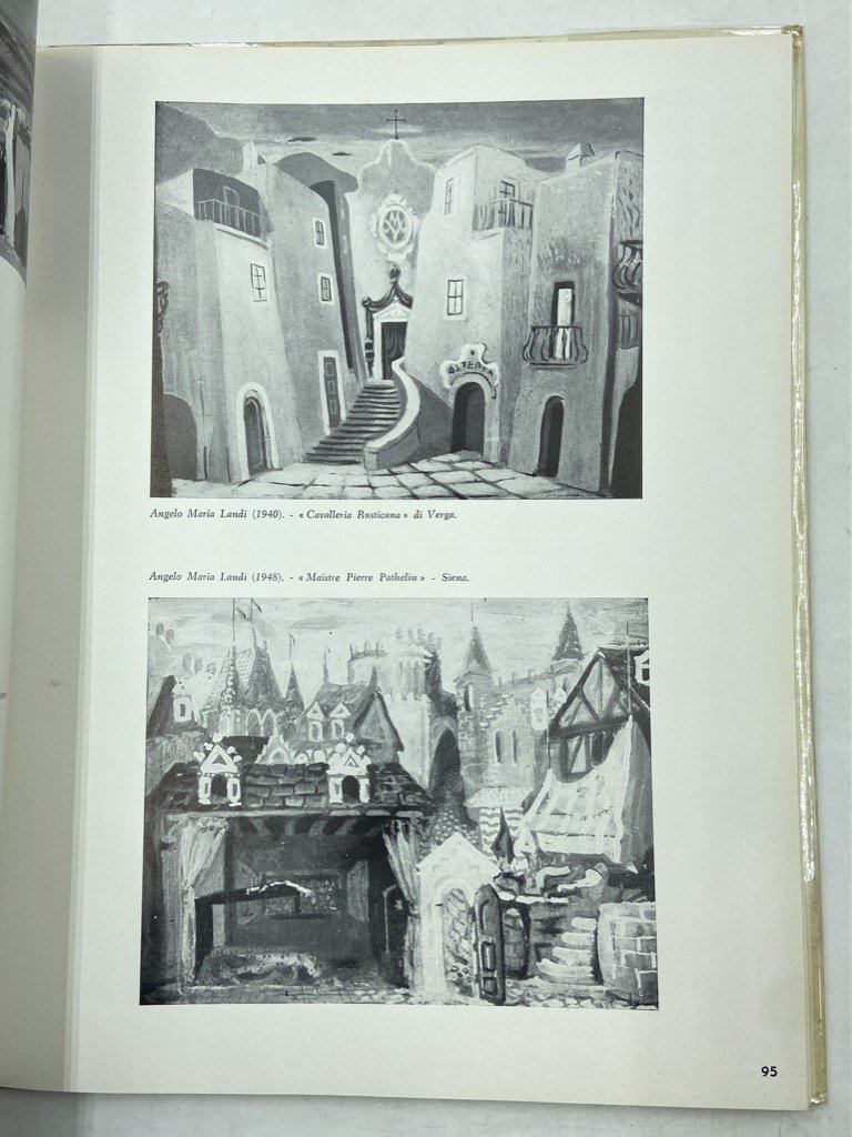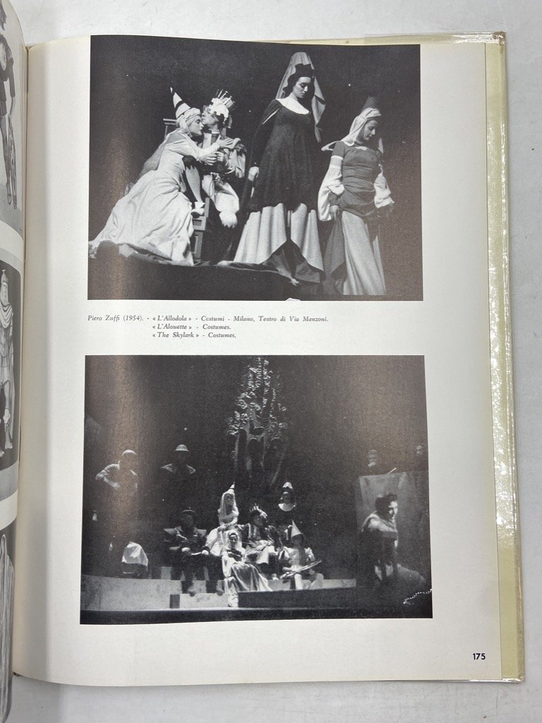 Tela editoriale con sovraccoperta illustrata da Emanuele Luzzati, cm 30x23, pp XXXIX (1) 182 (2), fotografico in nero. Mancanze sui bordi della sovraccoperta, peraltro ben conservato. Testi introduttivi di Guido Frette, Nicola Benois, Pino Casarini, Emanuele Luzzati, Guido Marussig, Piero Zuffi cui seguono 184 tavole in bianco e nero con immagini di scenografie, costumi e bozzetti di artisti quali Luciano Baldessari, Corrado Cagli, Felice Casorati, Giorgio de Chirico, Jean Cocteau, Fabrizio Clerici, Anna Maria Crespi, Salvador Dalì, André Derain, Léonor Fini, Salvatore Fiume, Gian Carlo Iliprandi, Savino Labò, Emanuele Luzzati, Guido Marussig, Mila de Nobili, Pablo Picasso, Enrico Prampolini, Alberto Savinio, Tomi Scialoia, Mario Sironi, Mario Vellani Marchi, Franco Zeffirelli.