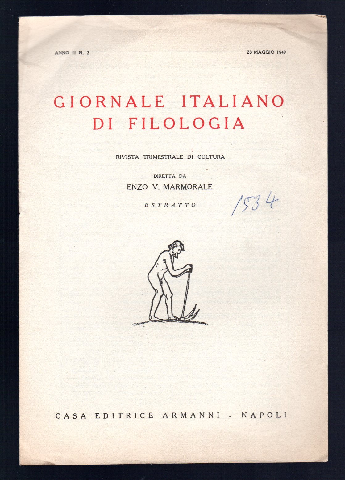 Opuscolo vintage. Estratto dal Giornale Italiano di Filologia - Anno. II - N. 2 - 28 maggio 1949, rivista trimestrale di cultura diretta Enzo V. Marmorale. Segni di biro in copertina. Usura da scaffale. Ordinario segno del tempo.