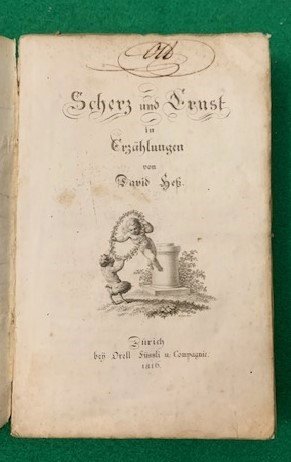 In 8°; (6), 323, (1) pp. Brossura coeva azzurra con pecetta con titolo a stampa al dorso. All'interno del piatto anteriore bell'ex-libris nobiliare ottocentesco illustrato che con la firma al margine alto del frontespizio, identifica l'esemplare come appartenuto a nota famiglia di origini svizzere. Vignetta al frontespizio. Esemplare in buone-ottime condizioni di conservazione. Prima edizione di quest'opera del noto scrittore svizzero, David Hess (Zurigo 1770 - ivi 1843) che fu membro del Gran Consiglio di Zurigo tra il 1815 ed il 1830. I suoi scritti più celebri furono Scherz und Ernst in Erzählungen (1816), Die Badenfahrt (1818), Die Rose von Jericho (1819), Salomo Landolt (1820), Landvogt vom Greifensee (pubbl. 1920). Hess fu testimone del massacro delle guardie svizzere da parte delle truppe rivoluzionarie francesi, che lo resero un convinto oppositore della Rivoluzione francese tanto che varie sue vignette satiriche, divennero dei classici della critica napoleonica. Nel divertente Badenfahrt del 1818 Hess descrisse la città di Baden e i suoi stabilimenti balneari e ne disegnò egli stesso le illustrazioni. Rif. Bibl.: Goedeke VI, 498, 5 u. XII, 92, 13.