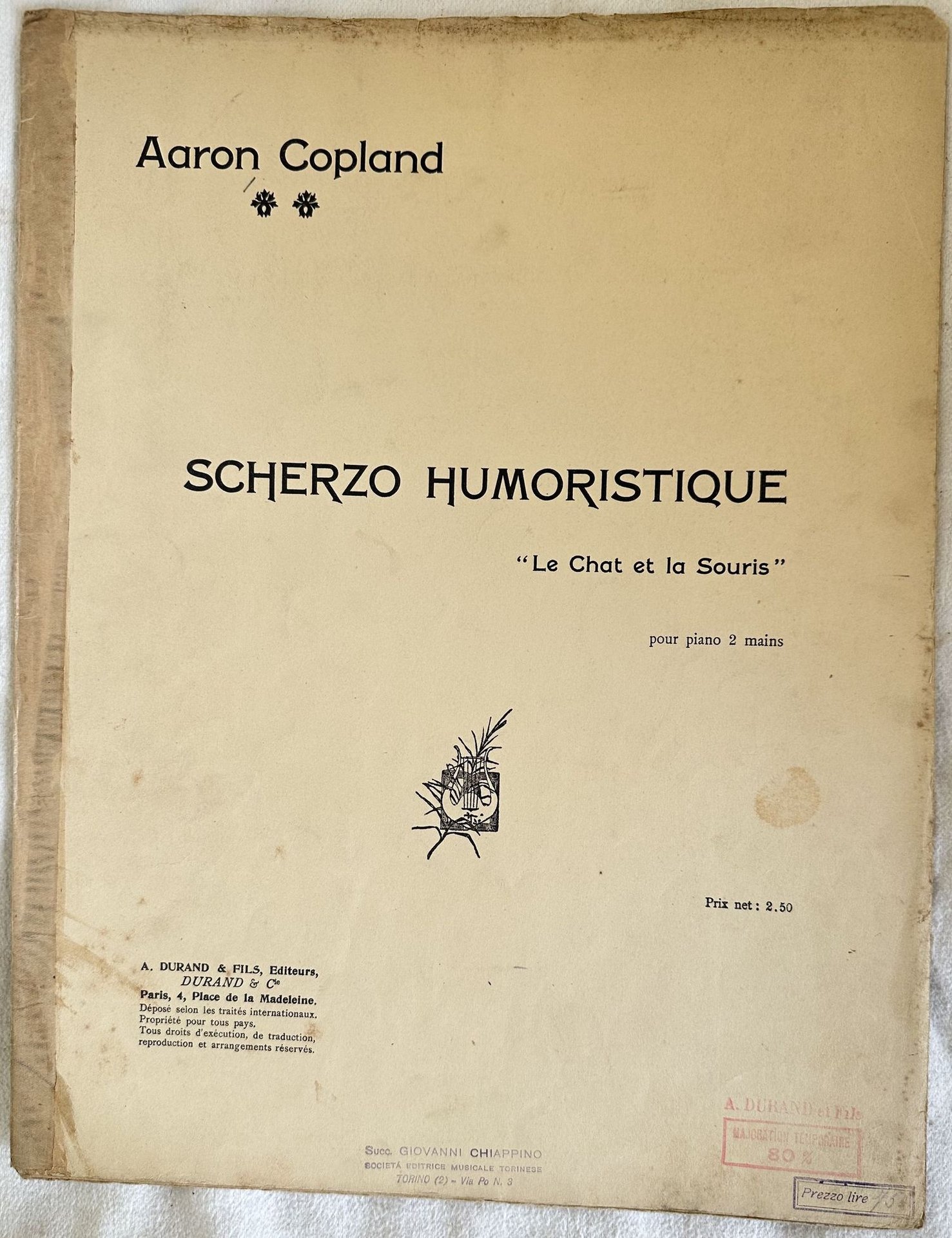 Edizione del 1921 di questo spartito per pianoforte della melodia "Scherzo humoristique "Le chat et la souris" del compositore americano Aaron Copland (1900-1990). In buone condizioni. Copertina editoriale in discrete condizioni con lievi usure marginali. Rinforzo al dorso. Legatura editorialmente assente. Pagine in buone condizioni con rare fioriture e alcuni strappi marginali. In folio. cm. 35,5x27,5. Pp. 5 Edition of 192 of this melody for piano "Scherzo humoristique "Le chat et la souris" by the american composer Aaron Copland (1900-1990) .In good conditions. Editorial cover in fair conditions lightly worn in the extremities. Reinforcement in the spine. Binding editoriarly missing. Pages in good conditions with occasional foxing and tears in the extremities. In folio. cm. 35,5x27,5. Pp. 5