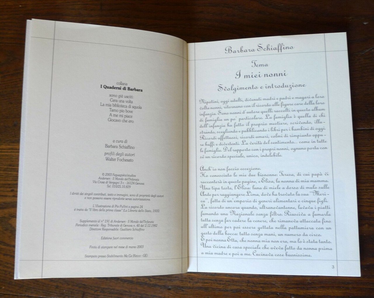 A cura di Barbara Schiaffino,profili degli autori: Walter Fochesato,I MIEI NONNI.Nonni e nonne d'autore nei ricordi deibambini che oggi sono scrittori,illustratori, giornalisti, editoridi libri per ragazzi.Feguagiskia' Studios, Genova 2003,supplemento al n.191 di Andersen - Il mondo dell'infanzia, periodico mensile,EDIZIONE FUORI COMMERCIO,brossura, 21x15 cm., pp.79,illustrazioni in bianco e nero,collana I QUADERNI DI BARBARA,peso: g.250