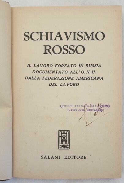Edizione senza data ma del 1950 circa di questo studio sul lavoro forzato in Russia documentato dall'ONU. All'interno: La lotta della Federazione Americana del lavoro contro il lavoro forzato, Dibattito sul lavoro forzato nel Consiglio Economico e Sociale dell'ONU, Disposizioni di ex internati dei campi di concentramento sovietici, Il totatlitarismo sovietico estende il sistema del lavoro fronzato oltre le frontiere russe, Il consiglio economico e sociale dell'ONU e il problema del lavoro forzato, Codice di lavoro correttivo della Repubblica Federale Socialista della Russia Sovietica ecc. Timbro al frontespizio. In ottime condizioni. Copertina editoriale in mezza tela in buone condizioni generali con lievi usure marginali. Legatura in buone condizioni. Pagine in buone condizioni con fioriture. In 8. Dim. 19x13 cm. Pp. 219+(1).Edition not dated but of 1950 circa of this study about slavery work in Russia documented by ONU. Stamp in the title page. In very good conditions. Half cloth editorial cover in good general conditions lightly worn in the extremities. Binding in good conditions. Inside pages are in good conditions with foxing. In 8. Dim. 19x13 cm. Pp. 219+(1).