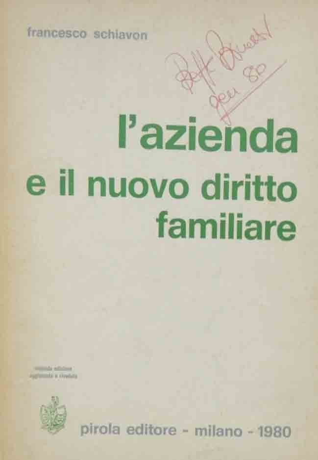 Francesco Schiavon, L’azienda e il nuovo diritto familiare, Pirola Editore, Milano 1980, seconda ed. aggiornata e riveduta, pp. 152, cm 24, br. ed. All’interno, fotocopia di un articolo di Paolo Borrillo, La prestazione di lavoro del pertecipe all’impresa familiare (estratto da La tribuna dei dottori commercialisti, s.d., pp. 12-15). Firma d’appartenenza a data alla prima di copertina. Leggeretracce d’uso alla brossura, minima ingiallitura della carta, per il resto ben conservato.