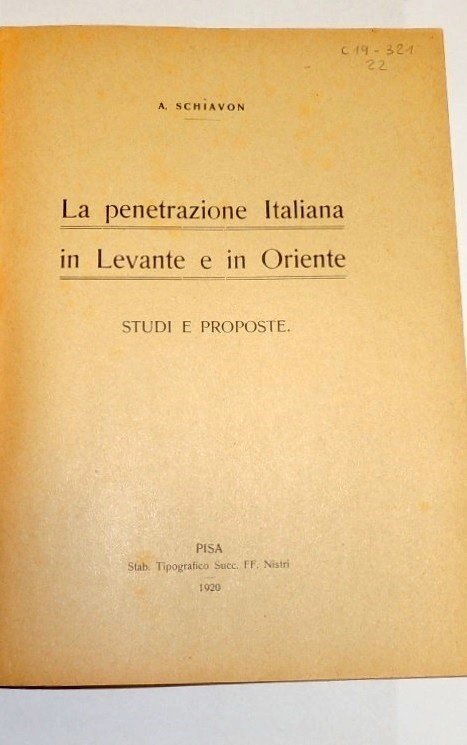 Antonio Schiavon, La penetrazione italiana in Levante e in Oriente. Studi e proposte, Stab. Tipografico Succ. FF. Nistri, Pisa 1920, pp. 63, 1 tav. ripiegata con carta geografica b.n., cm 25, br. ed. Fioriture alla brossura, per il resto ottimo esemplare.