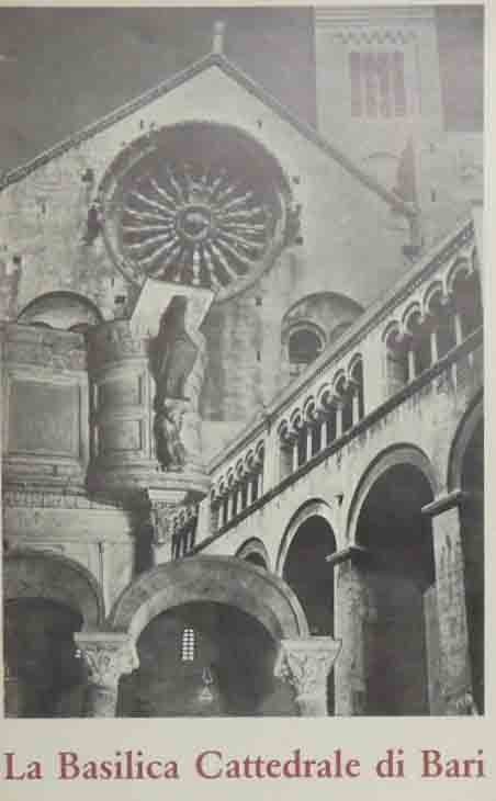 La Basilica Cattedrale, testo di Cesare Schino, s.n., s.l. (ma stampato a Bari, presso le Arti Grafiche Favia) 1980, rist. aggiornata, pp. 47, ill. b.n. e col., cm 23, pubblicazione spillata. In testa al frontespizio: Capitolo Metropolitano Primaziale di Bari. Titolo alla prima di copertina: La Basilica Cattedrale di Bari. Minima ingiallitura della carta, per il resto molto ben conservato.