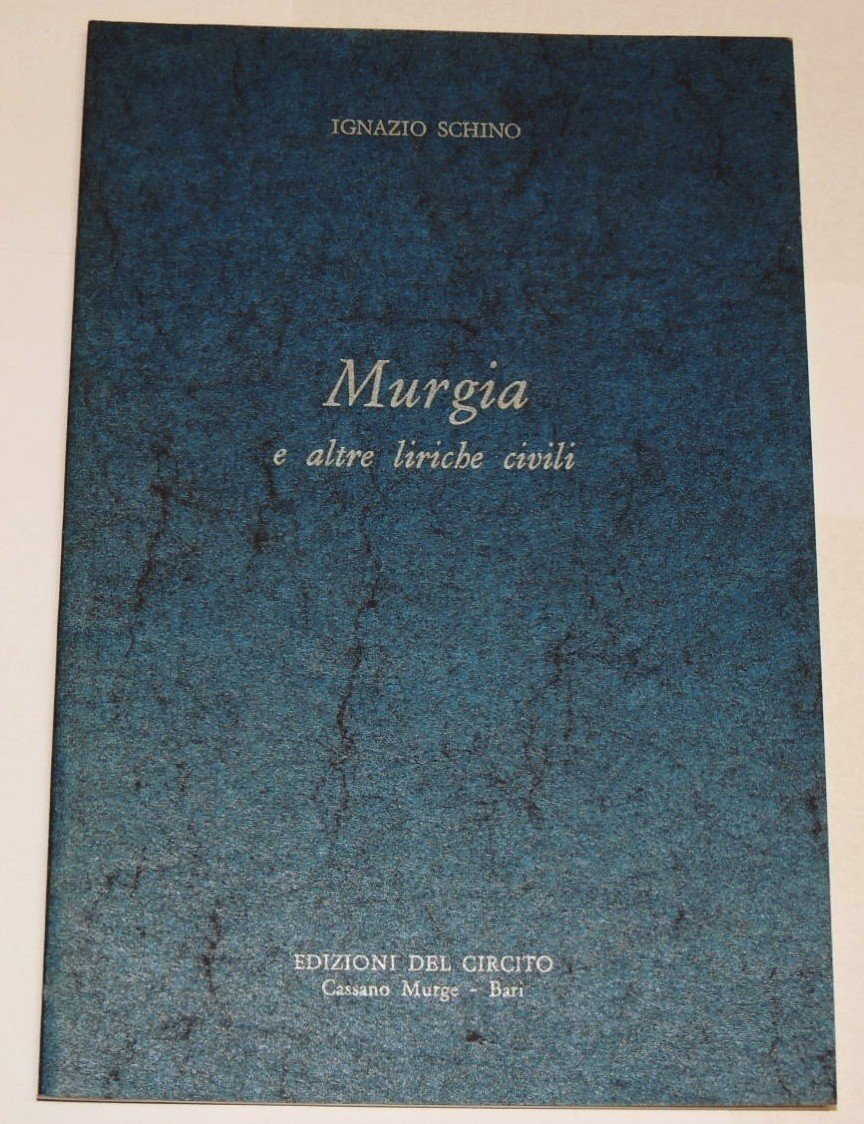 Ignazio Schino, Murgia e altre liriche civili, Edizionio del Circito, Cassano, 1977, pp. 34., cm 21, br. ed. Introduzione di Nicola Saponaro, Premio Ignazio Ciaia di Letteratura e saggistica.