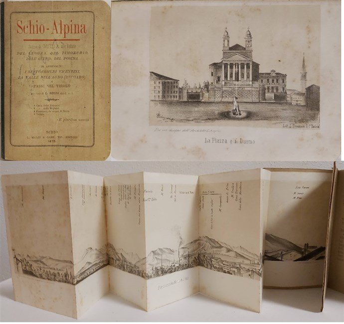 in-16, pp. XVII, 180, (16), bross. edit. Alle sguardie cartine geografiche del nord Italia (anteriore) e del vicentino (posteriore). Con una lunga carta litogr. in seppia ripiegata raffigurante il panorama dei monti di Schio, e 9 belle vedute litogr. in seppia, anche su doppia pagina. Con pagine di pubblicità di aziende locali al fine su carta gialla. Rara guida delle località del vicentino dal punto di vista storico, artistico e naturalistico. Belliss. esempl. [309]