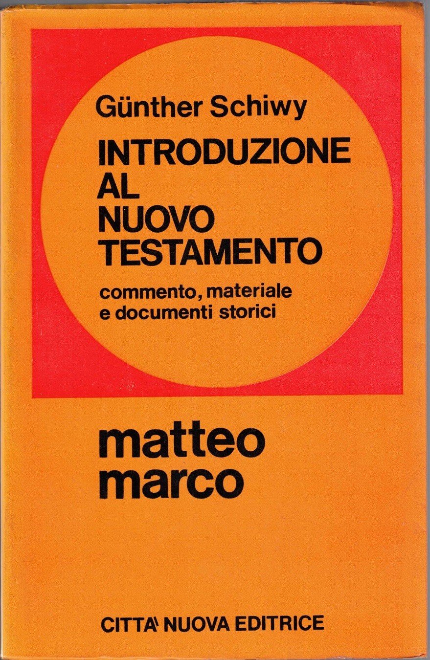 Gunther Schiwy, Introduzione al nuovo testamento. Commento, materiale e documenti storici. Volume primo: Matteo Marco, Città Nuova Editrice, Roma 1971, pp. 429, cm 20, br. ed. con alette. Titolo originale: Weg ins Neue Testament. I Band. Kommentar un Material. Traduzione di Dino Merli e Fortunato Frezza. Piccola annotazione a biro a margine dell’occhiello. Leggera brunitura della carta, per il resto esemplare ben conservato.