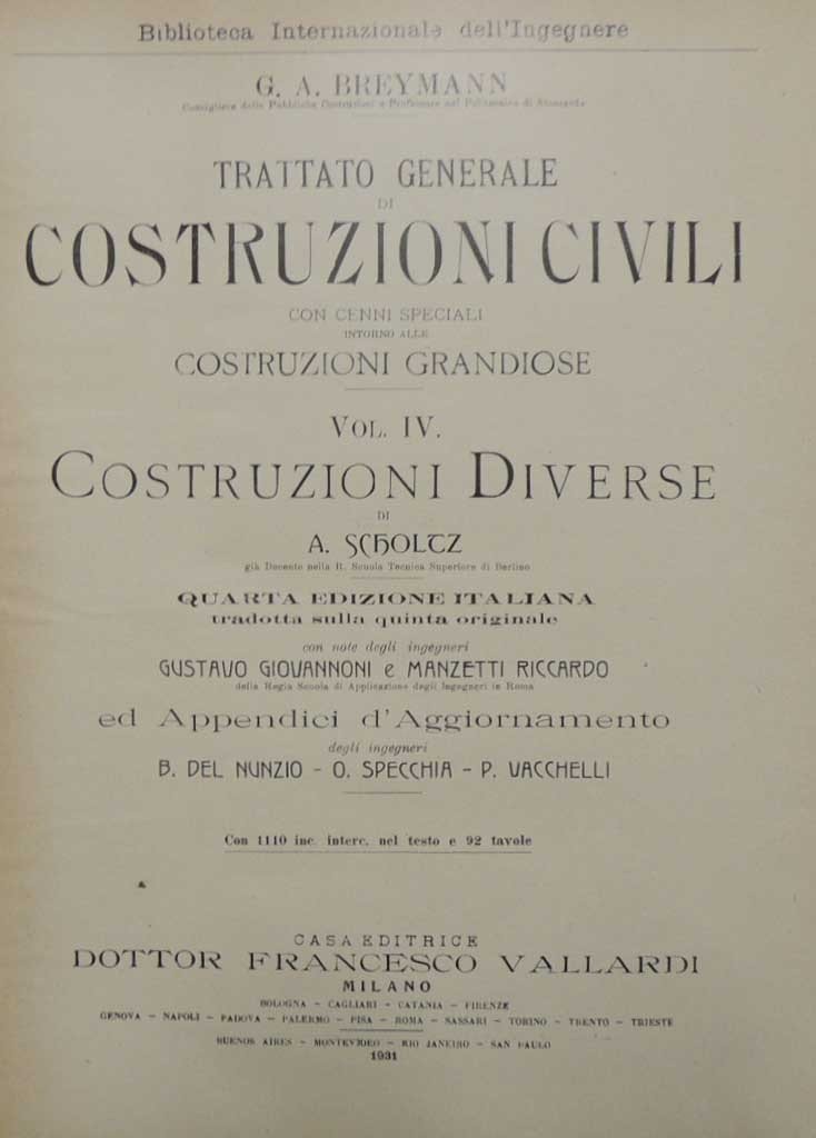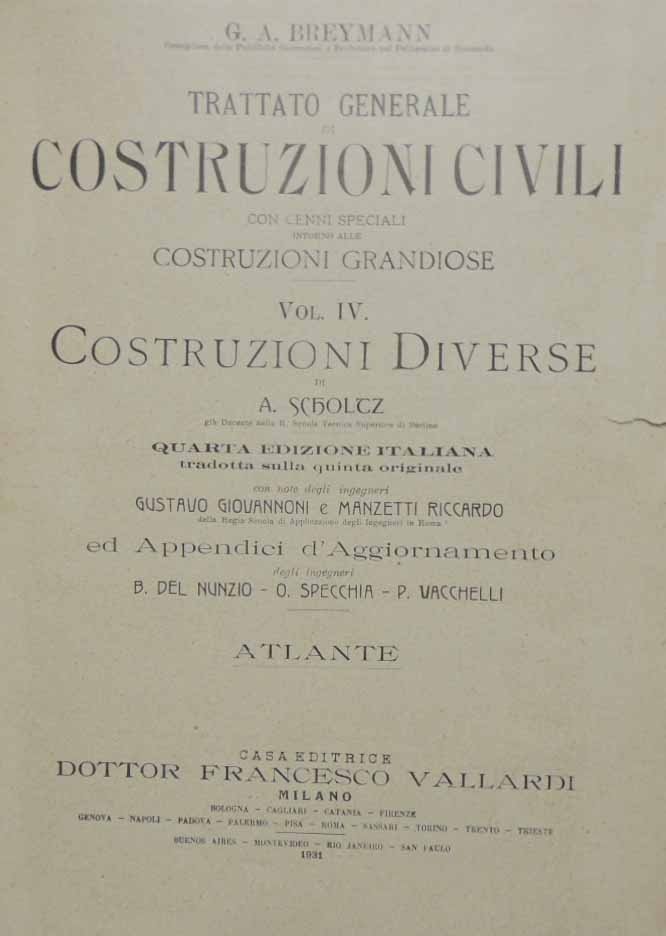 G. A. Breymann, Trattato generale di costruzioni civili con cenni speciali intorno alle costruzioni grandiose. Voll. IV. Costruzioni diverse di A. Scholtz, Casa Editrice Dottor Francesco Vallardi, Milano 1931, quarta ed. italiana tradotta sulla quinta ed. originale, con note degli Ing. Gustavo Giovannoni e Riccardo Manzetti, e Appendici d’aggiornamento degli Ing. B. Del Nunzio, O. Specchia, P. Vacchelli, pp. VIII, 810, ill. b.n., cofanetto in mezza tela con titoli dattiloscritti al dorso contenente Atlante di 89 tavv. sciolte ill. b.n. e col. di cui molte ripiegate, cm 29, mezza tela con titoli al dorso. Collana Biblioteca Internazionale dell’Ingegnere. Leggere tracce d’uso, minime fioriture e bruniture, uniforme brunitura della carta, lievi fessurazioni alle cerniera esterna del piatto anteriore e minime abrasioni al dorso, qualche strappetto senza mancanze al margine dell’ultima tavola, per il resto ottima copia ben conservata e con legatura solida.