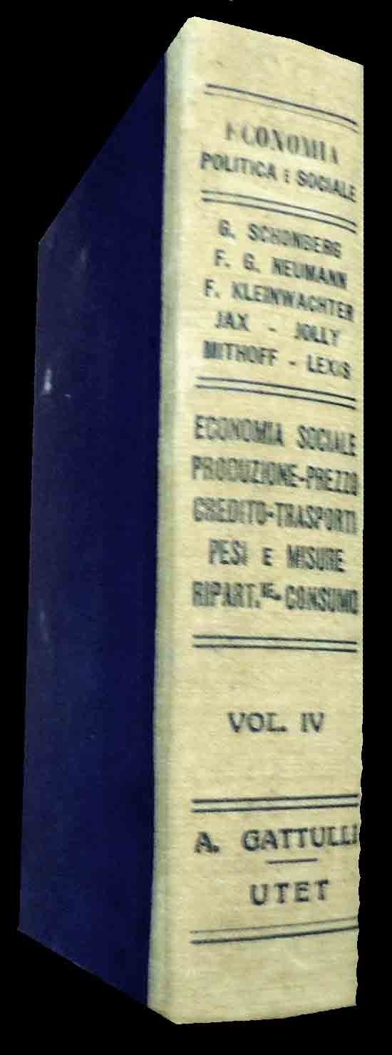 Manuale di economia politica di Gustavo Schonberg ovvero Gustavo Schonberg, La econonia sociale – E. Scheel, Storia dell'economia politica – E. Scheel, Socialismo e comunismo – F. G. Neumann, I concetti fondamentali della economia sociale – Federico Kleinwachter, La produzione economico-sociale in generale – F. G. Neumann, La formazione del prezzo – E. Nasse, Della moneta – Adolfo Wagner, Del credito e delle banche - Emilio Sax, Dei trasporti e delle comunicazioni – L. Jolly, Pesi e misure – Teodoro Mithof, La ripartizione economico-sociale – G. Lexis, Il consumo economico-sociale, Unione Tipografico-Editrice, Torino s.d. (1886?), pp. 894, cm 25, bella e solida legatura coeva in mezza tela con titoli e filetti al dorso e angoli in tela. Collana Biblioteca dell’economista. Serie terza. Raccolta delle più pregiate opere moderne italiane e straniere di economia politica diretta dal professore Gerolamo Boccardo, tomo IX, parte I. Minime fioriture, per il resto volume in perfetto stato di conservazione con interno pulito e legatura solida e ben tenuta.