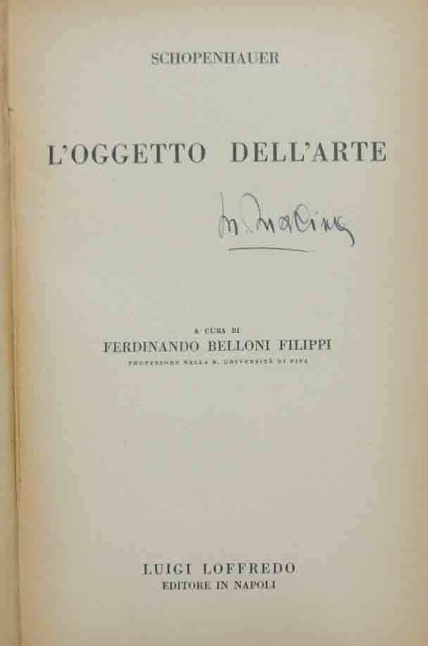 Arthur Schopenhauer, L’oggetto dell’arte, a cura di Ferdinando Belloni Filippini, Luigi Loffredo Editore, Napoli 1934, pp. XVII, 186, 6 c. di tavv. f.t. ill. b.n., cm 20, legatura in tutta tela ed. con titoli al dorso. Collana Pagine di filosofi per i giovani italiani. Firma d’appartenenza al frontespizio. Leggere tracce d’uso, unifrome brunitura della carta, minime fioriture, ma nel complesso buona copia.
