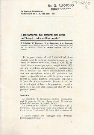 R. Schroder et al., Il trattamento del disturbi del ritmo nell’infarto miocardico acuto, pp. 28, cm 21, fascicolo spillato. Estratto da Deutsche Medizinische Wochenschrift, 91, n. 45, 1966, pp. 2022-2031. Autori: R. Schroder, W. Dissmann, H. J. Buschmann, J. Schneider. Piccolo timbro di appartenenza alla prima pagina. Minime fioriture, per il resto perfetto.
