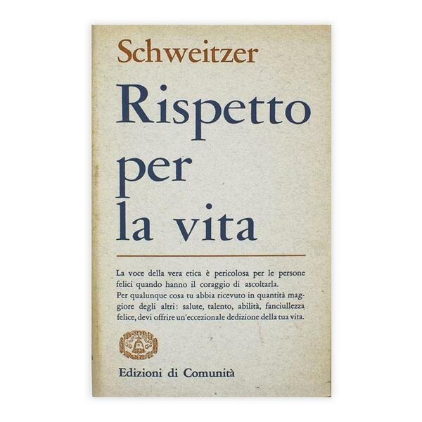 Autore: Schweitzer Titolo: Rispetto per la vita Edizione: Edizioni di comunità 1957 Dimensioni: 23x14 cm Pagine: 403 Copertina: Rigida con sovracopertina Condizioni: Buone come da foto