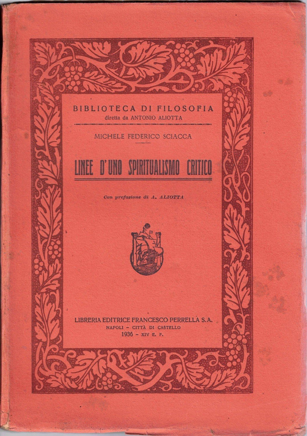 Michele Federico Sciacca, Linee d’uno spiritualismo critico, con prefazione di A. Aliotta, Libreria Editrice Francesco Perrella S. A., Napoli 1936, pp. 225, cm 26, br. ed. Collana Biblioteca di filosofia. Leggere tracce d’uso, ordinari segni del tempo, per il resto esemplare ben conservato.