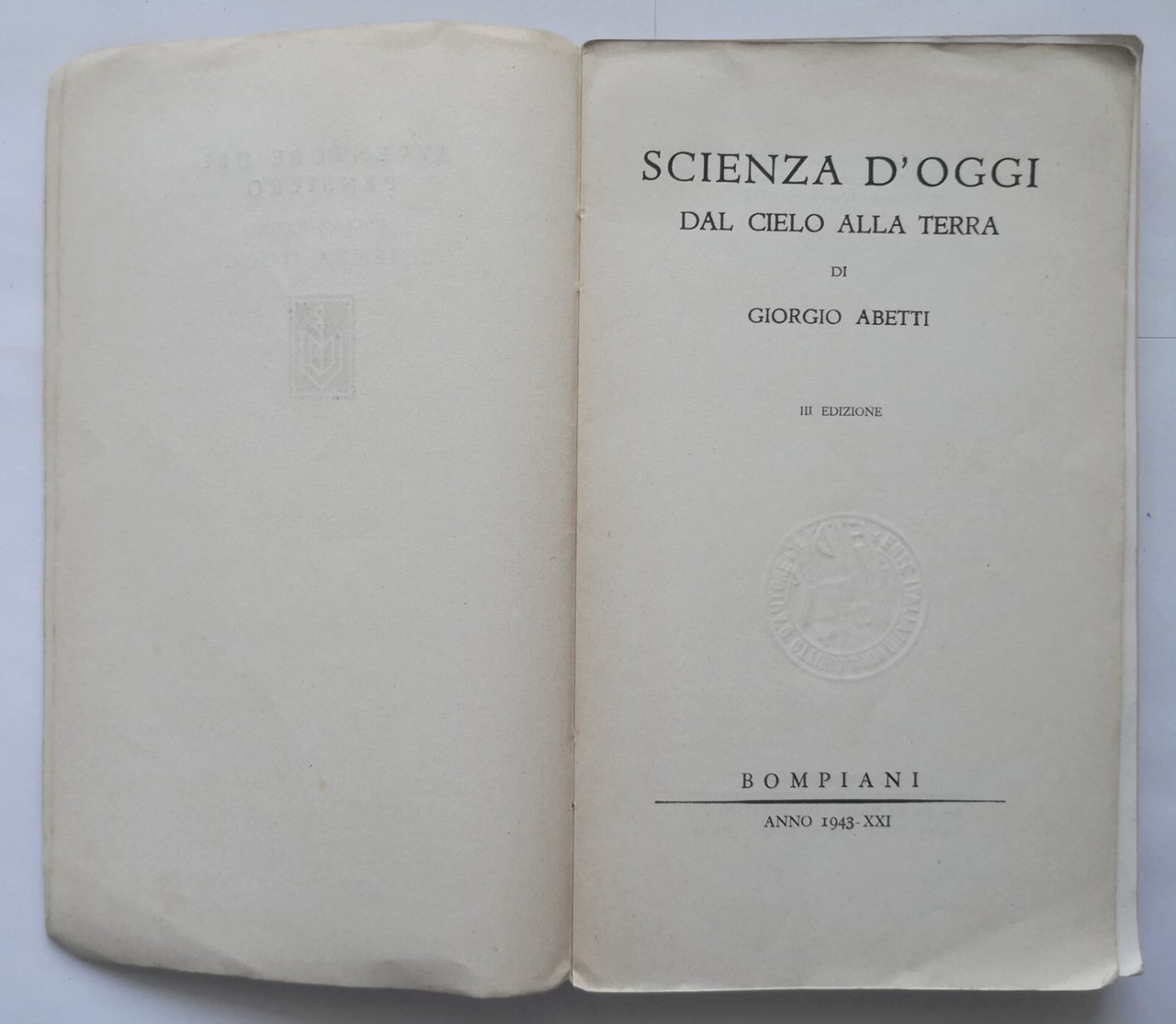 SCIENZA D'OGGI DAL CIELO ALLA TERRA di Giorgio Abetti 1943 Bompiani Libro