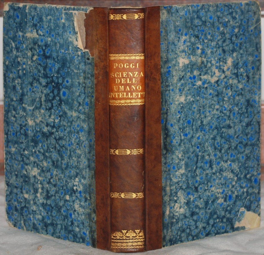 In 8. Dim. 22x15 cm. Pp. XII+423+5 (n.n.). Interessante opera completa in un volume del 1843, un'opera filosofica di Tommaso Fracassi Poggi da Cesena. L'opera è un trattato di ideologia, grammatica e logica. Tra gli argomenti trattati: intelletto, memoria e giudizio, immaginazione, influenza del linguaggio sulle facoltà intellettuali, idee, legge naturale, passioni, del vero, di Dio; la grammatica (linguaggio umano, discorso, verbi, aggettivi, sintassi, ortografia); dell'arte logica (raziocinio, proposizione ed altre forme di argomentazione). Bella legatura in mezza pelle con titolo e decorazioni in oro al dorso. In ottime condizioni. Copertina in mezza pelle con titolo e decorazioni in oro al dorso in buone condizioni generali con lievi usure e parti mancanti ai margini e dorso. Legatura in ottime condizioni. All'interno le pagine si presentano in ottime condizioni con rare fioriture. Lieve gora d'umidità al margine superiore. Interesting complete work in one volume of 1843, a phylosophical work by Tommaso Fracassi Poggi from Cesena. The work is a treaty of ideology, logical and grammar. Among the issues traeted: mind, memory and judgement, immagination, influence of language on intellectual faculties, ideas, natural law, passions, God; grammar (human language, speech, verbs, adjectives, sintax, ortography); logical art (poposizione ed altre forme di argomentazione). Bella legatura in mezza pelle con titolo e decorazioni in oro al dorso. In ottime condizioni. Half leather cover with golden title and decorations in the spine in good general conditions slightly worn with missing parts in the edges and spine. Binding in very good conditions. Inside pages are in very good conditions with occasional foxings.