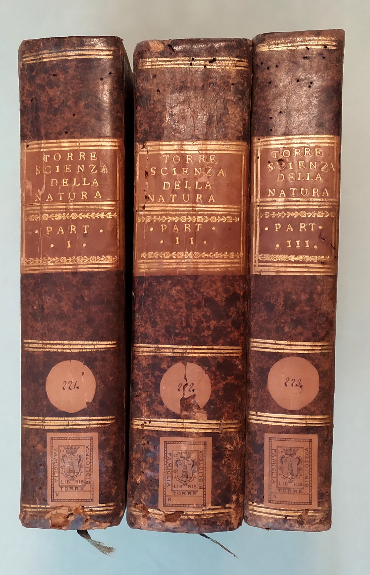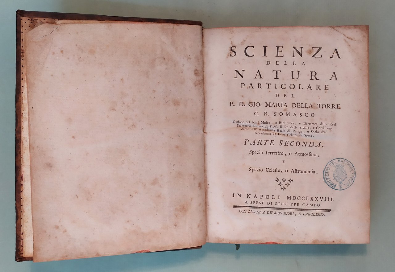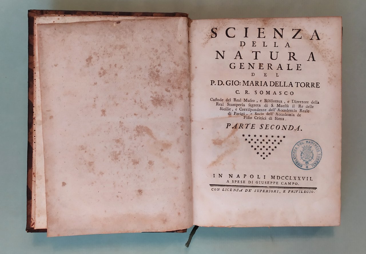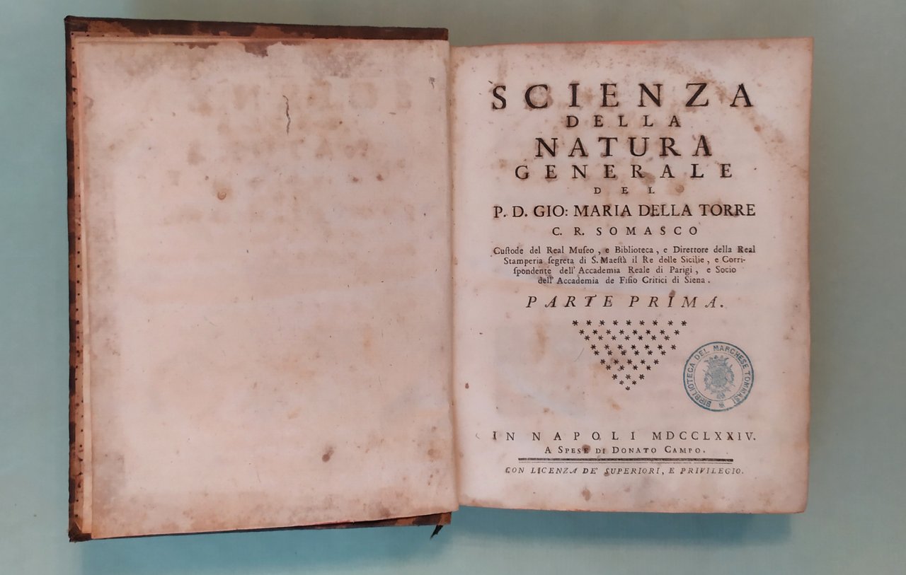 DELLA TORRE Gio. Maria. Scienza della natura generale. In Napoli, a spese di Donato Campo, 1774 - 1778. Due parti in tre volumi in 8vo; pp.XII, 544; 6n.nn., 573; 160, 200. Ottantacinque tavole spieghevoli incise in rame da Filippo De Grado. Capilettera figurati. Lievi fioriture. Bazzana coeva, doppio tassello ai dorsi con titolo e fregi in oro. Houzeau - Lancaster, 9363; Riccardi II, 541: "Questa voluminosa opera può considerarsi come un completo trattato di Fisica - matematica. La prima parte tratta della materia, della estensione, della resistenza, del moto e della qualità dei corpi. Nella seconda si occupa della figura e grandezza della terra, della sua interna costituzione, degli animali, dei vegetali, dei corpi che si trovano alla sua superficie, e dell'atmosfera. sono notevoli i miglioramenti dell'autore immaginati nella costruzione dei cannocchiali e nei microscopi, dei quali si occupa nell'ottica che forma parte del trattato sull'atmosfera".