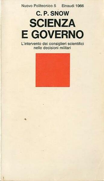 148 p. ; 18 x 11 cm. Nuovo politecnico, 5. Il tema di questo libro - sempre attuale - è il rapporto fra gli uomini politici cui sono affidate le decisioni fondamentali e gli scienziati chiamati a collaborare con loro. Le scelte decisive sono esercitate da un gruppo ristretto di persone, in segreto, senza possibilità di discussione e controllo: di qui l'importanza, e il rischio, di doversi basare sulla «preveggenza» dei consiglieri scientifici, come dimostrano taluni gravi errori del governo Churchill durante la Seconda guerra mondiale, su cui l'autore fa rivelazioni di estremo interesse. Snow ci offre poi una vivace rievocazione dell'ambiente scientifico di Cambridge tra il 1920 e il 1930, e insiste su un altro tema che gli è caro, la «non neutralità morale della scienza», rinnovando un appello appassionato alla responsabilità etica e alla preveggenza. Traduzione di Luciano De Maria. Brossura editoriale, coperta in cartoncino flessibile plastificato lucido. Qualche segno del tempo al taglio, per il resto libro integro. Codice libreria 6813.