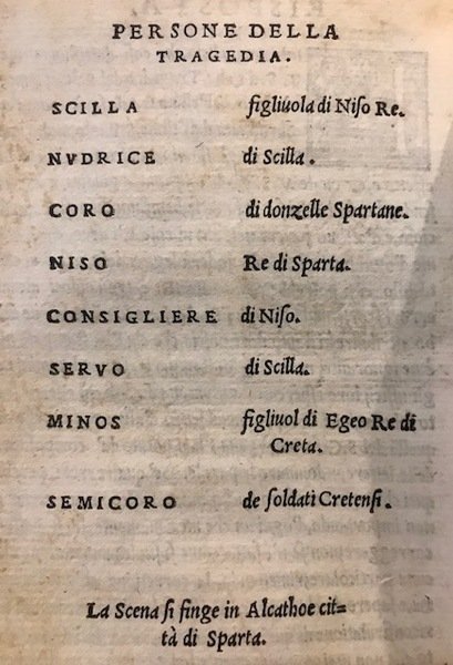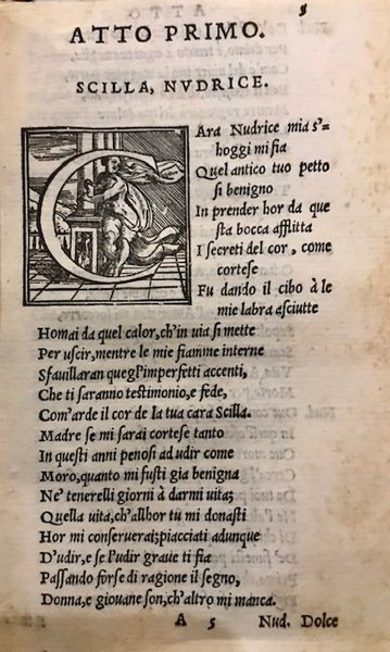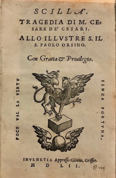 8vo (cm. 14,3), 51 cc., 1 c.nn. bianca. Marca tipografica di Giovanni Griffi il vecchio al frontespizio e di Giovanni Griffi il vecchio il vecchio e il giovane al verso dell’ultima carta. Iniziali xilografiche. Legatura in pergamena rigida. Tagli azzurri. Esemplare in ottimo stato di conservazione, solo leggermente rifilato. Edizione originale di questa tragedia in cinque atti in versi sciolti. Allacci, 701 (con la data erronea 1558). Chiesa, ‘Teatro italiano del cinquecento’, n. 58. Adams, C-1294.