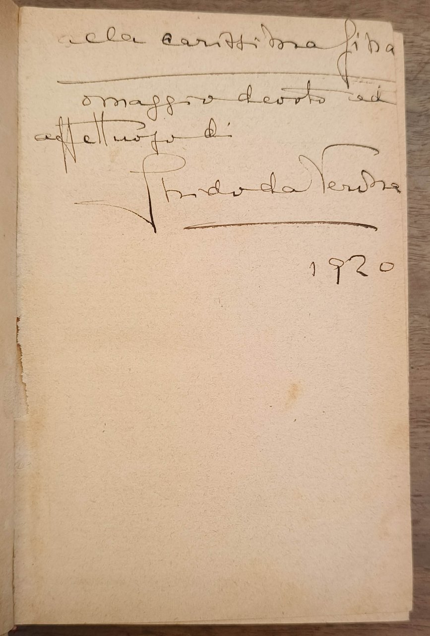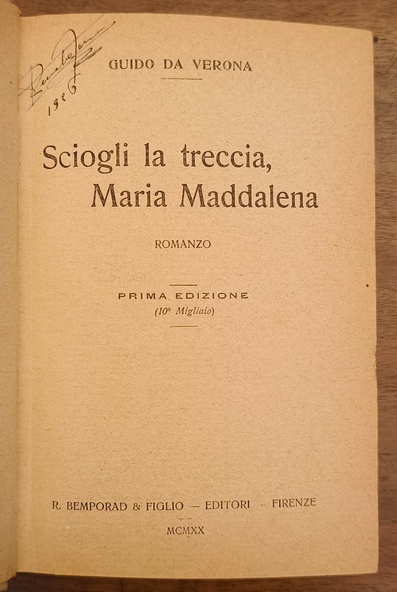 Sciogli la treccia, Maria Maddalena, Firenze, Bempoard, 1920. Prima edizione. Cm 18,2. Pp. 307. Legatura in mezza pergamena, al dorso tassello in pelle con autore, titolo e iniziali "R.T." in oro. Carte brunite. Ex libris inciso nel risguardo di Renata Terni. Dedica autografa dell'autore all'antiporta datata 1920.