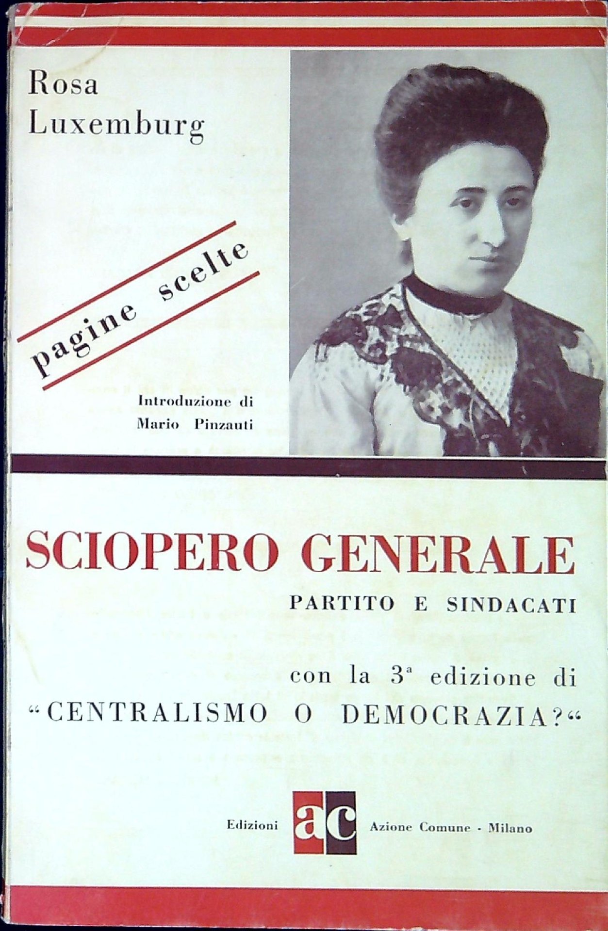 Luxemburg, Rosa Sciopero generale; partito e sindacati : pagine scelte. Milano, Edizioni Azione comune 1963, 21 103 p. 103 p. ; 21 cm In cop.: Introduzione di Mario Pinzauti. (50924)