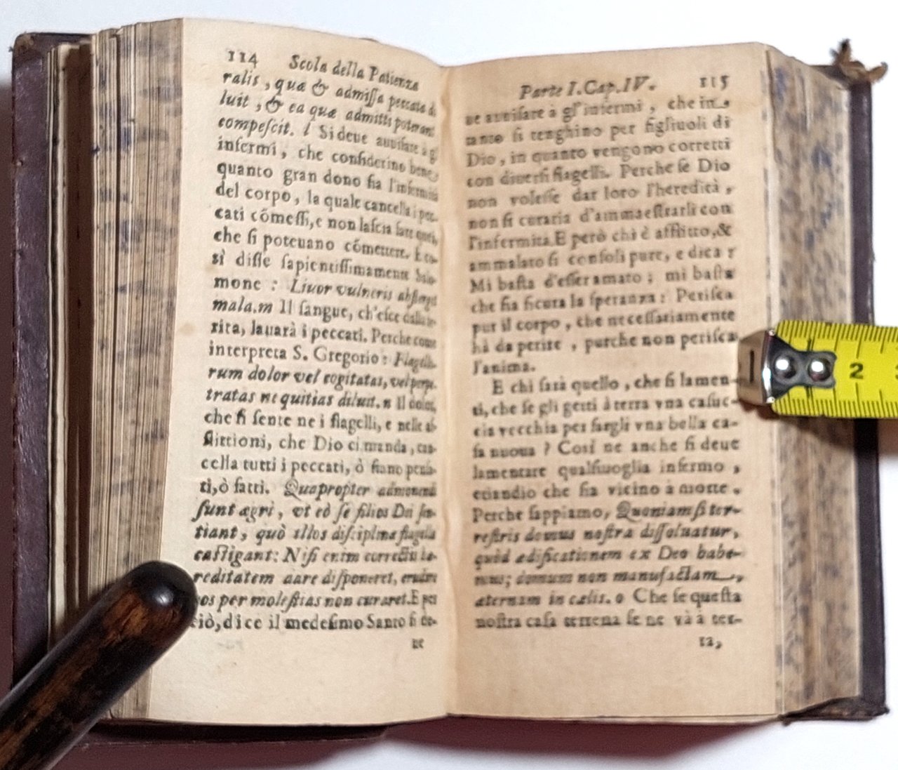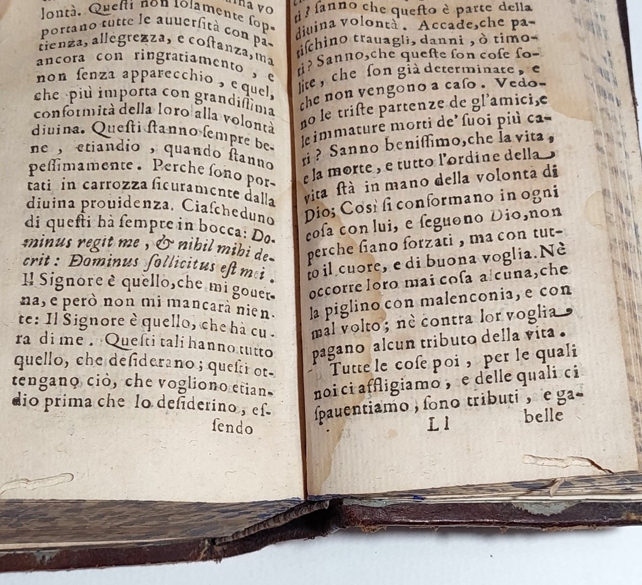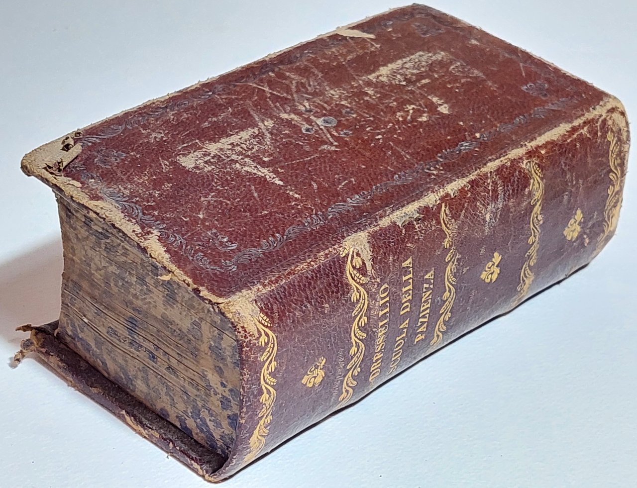 Opera divisa in tre parti, legatura rigida in pelle marrone, piatti con abrasioni e mancanze ai margini, bordura impressa a secco ai piatti, dorso con fregi e titolo in oro segni di usura e abrasioni, tagli con macchie spruzzati impolverati quelli superiori, al margine inferiore del frontespizio annotazione coeva a penna, frontespizio figurato, interno in discreto stato, un lieve alone al margine superiore interno alle prime pagine, tre incisioni all’inizio di ogni parte, alcune pagine brunite, fioriture alle pagine interne che non vanno a disturbare la lettura, una macchia al margine destro da pag 370 a pag. 450, da pag. 773 a pag. 810 foro di tarlo al margine inferiore delle pagine senza interessamento del testo, numero pagine (12)+ 872, dimensioni cm 14,2 * 8 * 5