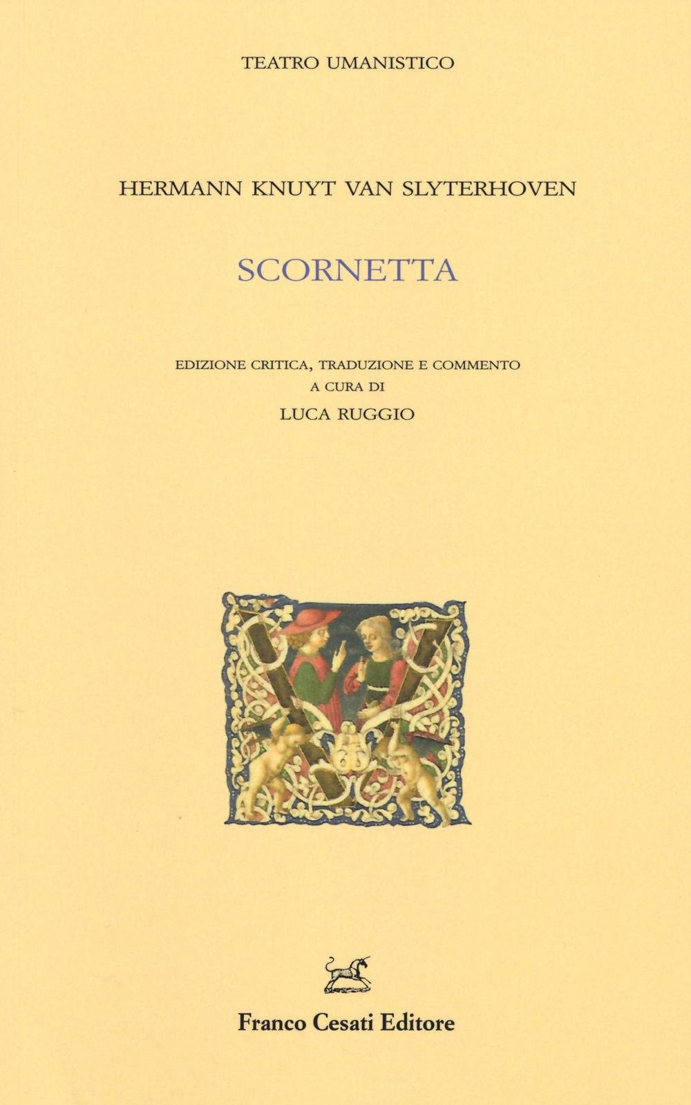 La “Scornetta”, commedia latina in esametri dell'umanista olandese Hermann Knuyt van Slyterhoven, occupa una posizione assolutamente originale nell'ambito del teatro umanistico sia per l'ambientazione campestre sia per i numerosi richiami virgiliani, che la avvicinano più a un dramma pastorale che non a una vera e propria commedia. L'autore, attraverso un lungo dialogo che ha per oggetto le battute pungenti e licenziose che i personaggi si rivolgono a vicenda e in un contesto di gioia agreste che evoca le Ecloghe di Virgilio, tenta a suo modo di amalgamare commedia e poesia. Il testo critico dell'opera, corredato dalla traduzione in lingua italiana e dalle note di commento, è preceduto da un cenno sulle vicende biografiche dell'autore e sull'ambiente nel quale la commedia è stata composta, da un quadro introduttivo sui modelli e sulla lingua e dalla nota al testo.