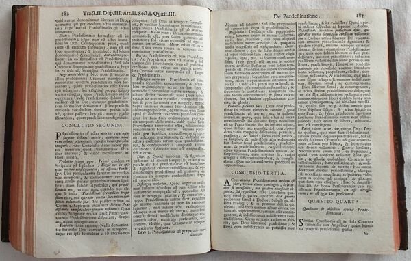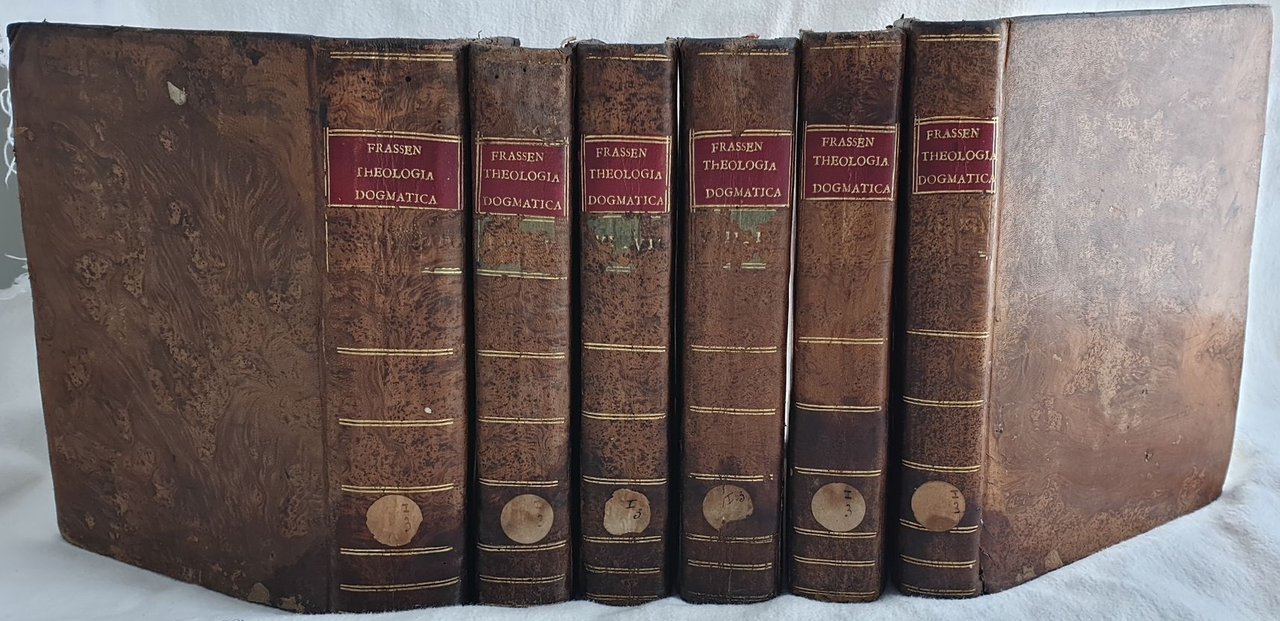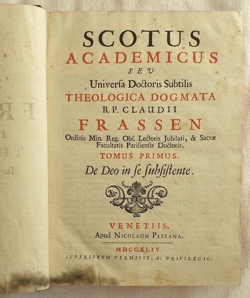 Edizione Pezzana del 1744 di questa celebre opera di Claude Frassen (1620- 1711) teologo scotista francescano e filosofo, importante studioso della filosofia di Johann Duns Scoto. L'opera è formata da 12 tomi rilegati in 5 tomi ed è completa. Questo suo trattato è giustamente considerato una delle più importanti opere di studio sulla teologia di Duns Scoto. Pochi altri commentatori hanno saputo trasmettere come Frassen la semplicità dello stile e la chiarezza del metodo che ha caratterizzato la teologia scotistica. All'interno numerose citazioni dei Padri della Chiesa e un imparziale dichiarazione di tutte le controverse questioni di teologia scolastica. All'inizio del primo volume una lista cronologica e un breve resoconto storico e dogmatico delle eresie dagli inzii dell'era cristiana fino al XV secolo. Tagli rossi. Alcune antiche note manoscritte e in qualche tomo piccolo disegno: ritratto di Frassen. In buone condizioni e completo. Copertina in piena pelle con titolo in oro su tassello al dorso in buone condizioni generali con lievi usure marginali. Legatura in buone condizioni. Pagine in buone condizioni con fioriture. Alcune lievi gore d'umidità marginali. In 8. Dim. 23x17 cm. Pp. (44)+358+(10)+(4)+309+(7)+(4)+205+(7), (4)+302+(10)+(6)+322+(8), (4)+169+(7)+(4)+413+(15), (4)+389+(11)+(4)+305+(13), (4)+601+(15), (4)+349+(11)+(4)+175+(5). Peso Kg. 6Pezzana edition of 1744 of this famosu work by Claude Frassen (1620- 1711) scotist theologist franciscan and phylosopher, important scholar of the phylosophy of Johann Duns Scoto. The work is made up fo 12 tomes bound in in 5 tomes and it is complete. This work is rightly considered one of the most important and scholarly presentations of the theology of Duns Scotus. Few, if any, of the numerous interpreters and commentators of Scotus have succeeded so well as Frassen in combining simplicity of style and clearness of method with that subtleness of thought which characterizes Scotistic theology as a whole. The value of the work is enhanced by frequent quotations from the Church Fathers, and by an impartial statement of all controversial questions in scholastic theology. The first volume is prefaced with a chronological list and a brief historical and dogmatical account of the different heresies from the beginnings of Christianity to the fifteenth century. Some antique handwritten notes and some little drawing of the portrait of Frassen. In good conditions and complete. Copertina in piena pelle con titolo in oro su tassello al dorso in buone condizioni generali con lievi usure marginali. Legatura in buone condizioni. Pagine in buone condizioni con fioriture. Alcune lievi gore d'umidità marginali. In 8. Dim. 23x17 cm. Pp. (44)+358+(10)+(4)+309+(7)+(4)+205+(7), (4)+302+(10)+(6)+322+(8), (4)+169+(7)+(4)+413+(15), (4)+389+(11)+(4)+305+(13), (4)+601+(15), (4)+349+(11)+(4)+175+(5). Peso Kg. 6 Full leather cover with gilted spine title leather label in good general conditions lightly worn in the extremities. Binding in good conditions. Inside pages are in good conditions with foxing. Some dump stains in the extremities. In 8. Dim. 23x17 cm. Pp. (44)+358+(10)+(4)+309+(7)+(4)+205+(7), (4)+302+(10)+(6)+322+(8), (4)+169+(7)+(4)+413+(15), (4)+389+(11)+(4)+305+(13), (4)+601+(15), (4)+349+(11)+(4)+175+(5). Weight Kg. 6