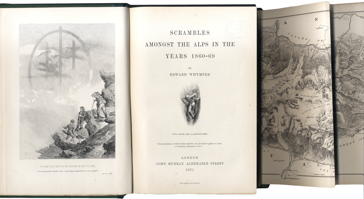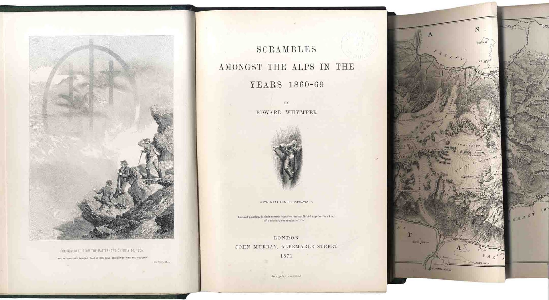 >in-8, pp. XVIII, (2), 432, leg. del tempo m. pelle, dorso (restaurato) con ricchi fregi i oro e titolo. Magnificamente illustrato da 90 vignette n.t. e 21 tavole in silografia f.t. di Whymper stesso e 5 carte geografiche ripieg. f.t. Prima edizione (presto tradotta in francese e pubblicata nel 1873 col titolo "Escalades dans les Alpes de 1860 à 1869") di opera sicuramente tra le più importanti, conosciute ed influenti della letteratura alpina di ogni tempo, "récits des ascensions réalisées par Whymper, en particulier de ses tentatives au Cervin et de la dramatique première ascension" (Perret). Whymper (1840-1911) da giovane fu pittore ed incisore, sulle orme del padre, più tardi divenne alpinista scalatore tra i più coraggiosi e noti di tutti i tempi: conquistò, tra gli altri, il Cervino (nel 1865), l'Aiguille Verte, le Grandes Jorasses, il Mont-Dolent e, nelle Ande equatoriali, il Chimborazo (di olte 6000 mt.). Buon esemplare (alcune tavole staccate). Perret 4557, note: «Cet ouvrage est le plus connu de tous les livres de montagne». Neate W65:«The most famous of all mountaineering books». Mathews 319. ACL 336.