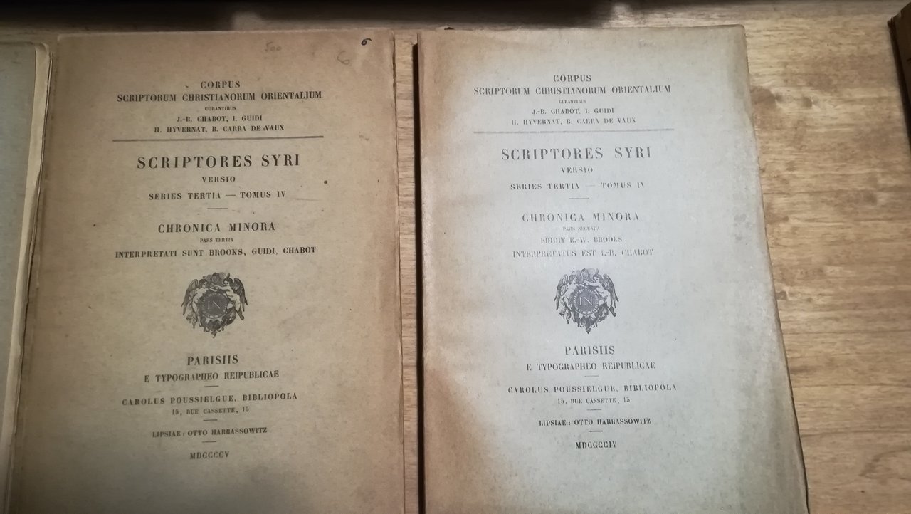Corpus Scriptorum Christianorum Orientalium Brooks, Guidi, Chabot Scriptores Syri Versio series tertia - Tomus IV Chronica minora Pars prior (1 of 2), Interpretatus est Ignatius Guidi 1903 32p Pars segunda, Interpretatus est I. B. Chabot 1904 Pars tertia, Interpretatiu sunt Brooks, Guidi, Chabot 1905 Lipsiae: Otto Harrassowitz Libri in ottime condizioni, minimi segni del tempo: minime abrasioni o piccoli difetti alle copertine e ai margini, piccoli numeri annotati sulle copertine. Non esitate a contattarci per altre foto o richieste. Saremo lieti di soddisfare ogni vostra esigenza.