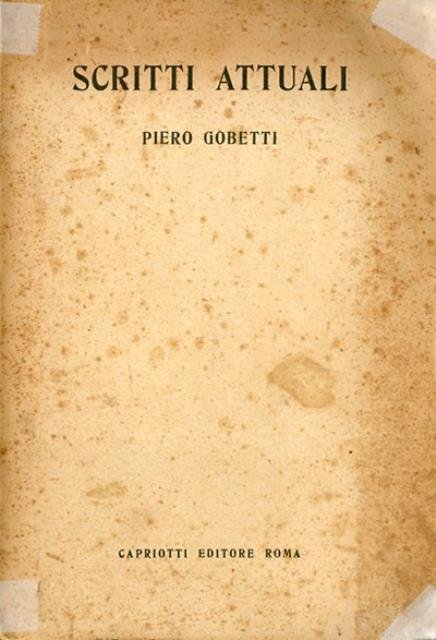145 p. ; 24 x 16 cm. Politica, 4. Piero Gobetti creò e diresse le riviste Energie Nove, La Rivoluzione liberale e Il Baretti, oltre a fondare l'omonima casa editrice, dando importanti contributi alla vita politica e culturale, prima che le aggressioni, le percosse e i pestaggi subiti ripetutamente dagli interventi dello squadrismo fascista, provocassero un forte declino delle sue condizioni di salute e dunque la morte prematura a nemmeno 25 anni durante l'esilio francese. Prefazione di Umberto Calosso. Brossura editoriale, coperta in cartoncino flessibile, titolo impresso in nero al piatto e al dorso. Segni del tempo alla coperta, ai risvolti e alle pagine interne (imbrunimento della carta e fioriture). Lacerazioni al dorso e agli angoli del piatto riparati con nastro adesivo, manca la sovraccoperta originale, firma di app. nell'occhietto, per il resto libro integro. Codice libreria 8937.