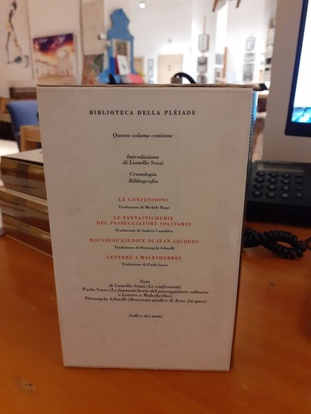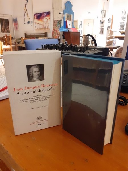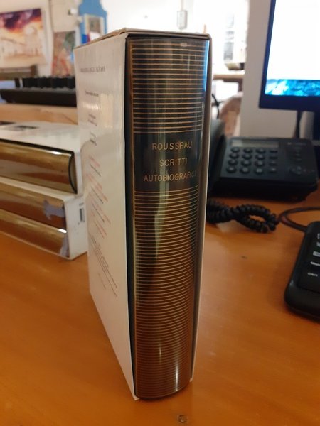 Volume con cofanetto (macchiato dalla polvere) e volume con copertina in pelle, scritte e decorazioni in oro, carta di riso e foglio di acetato.