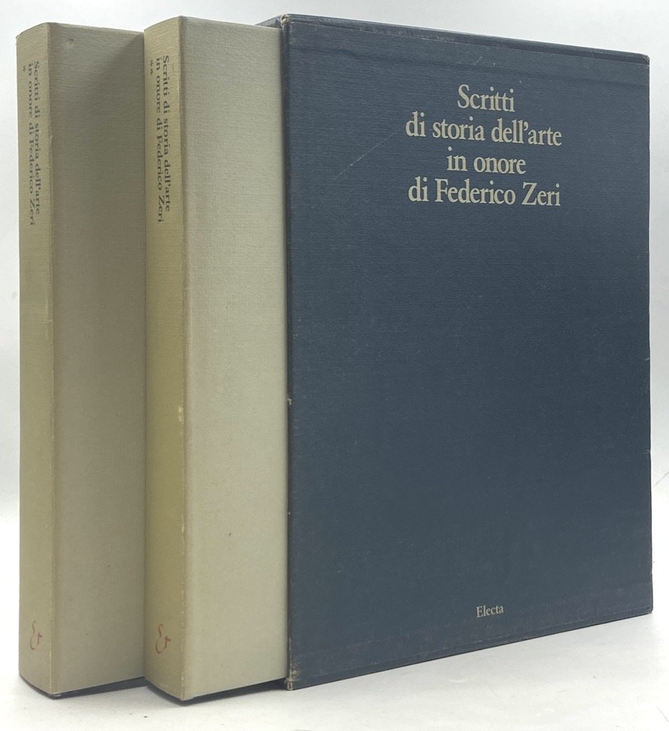 Due volumi in tela con sovraccoperta in cofanetto rigido, cm 28 x 22, pp 504 (4), (4) 513-941 (3), con numerose illustrazioni in nero. Corposa raccolta di contributi storico critici in onore di Federico Zeri, in italiano, inglese, francese e tedesco.