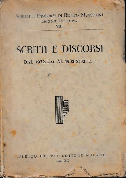 Bross. editoriale con alette in-8°(cm 22x15,5), pp. 293., titolo nero al dorso. Ritratto fotografico di Mussolini in antiporta protetto da velina. Buone condizioni, rare sottolineature a matita. Scritti e discorsi di Benito Mussolini. Edizione definitiva.