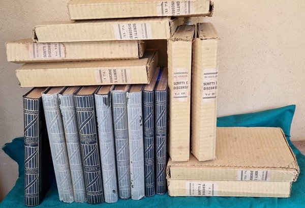 OPERA INTONSA MAI LETTA SON PRESENTI ANCORA QUASI TUTTI I CARTONI ORIGINALI DOVE ERANO CONSERVATI PIU' LA VELINA Scritti e discorsi di Benito Mussolini,10 volumi, opera pubblicata da Hoepli,1934-40. Ritratto del Duce, protetto da velina,all'antiporta . Legatura in tela bicolore con titolo e decorazioni in oro al dorso,taglio superiore dorato. ELENCO TITOLI : Vol.I: Dall'intervento al fascismo (15 novembre 1914-23 marzo 1919). Vol.II: La rivoluzione fascista (23 marzo 1919-28 ottobre 1922). Vol.III: L'inizio della nuova politica (28 ottobre 1922-31 dicembre 1923. Vol.IV: Il 1924. Vol.V: Scritti e discorsi dal 1925 al 1926. Vol.VI: Scritti e discorsi dal 1927 al 1928. Vol.VII: Scritti e discorsi dal 1929 al 1931. Vol.VIII: Scritti e discorsi dal 1932 al 1933. Vol.IX: Scritti e discorsi dal gennaio 1934 al 4 novembre 1935. Vol.X: Scritti e discorsi dell'Impero (novembre 1935-4 novembre 1936)