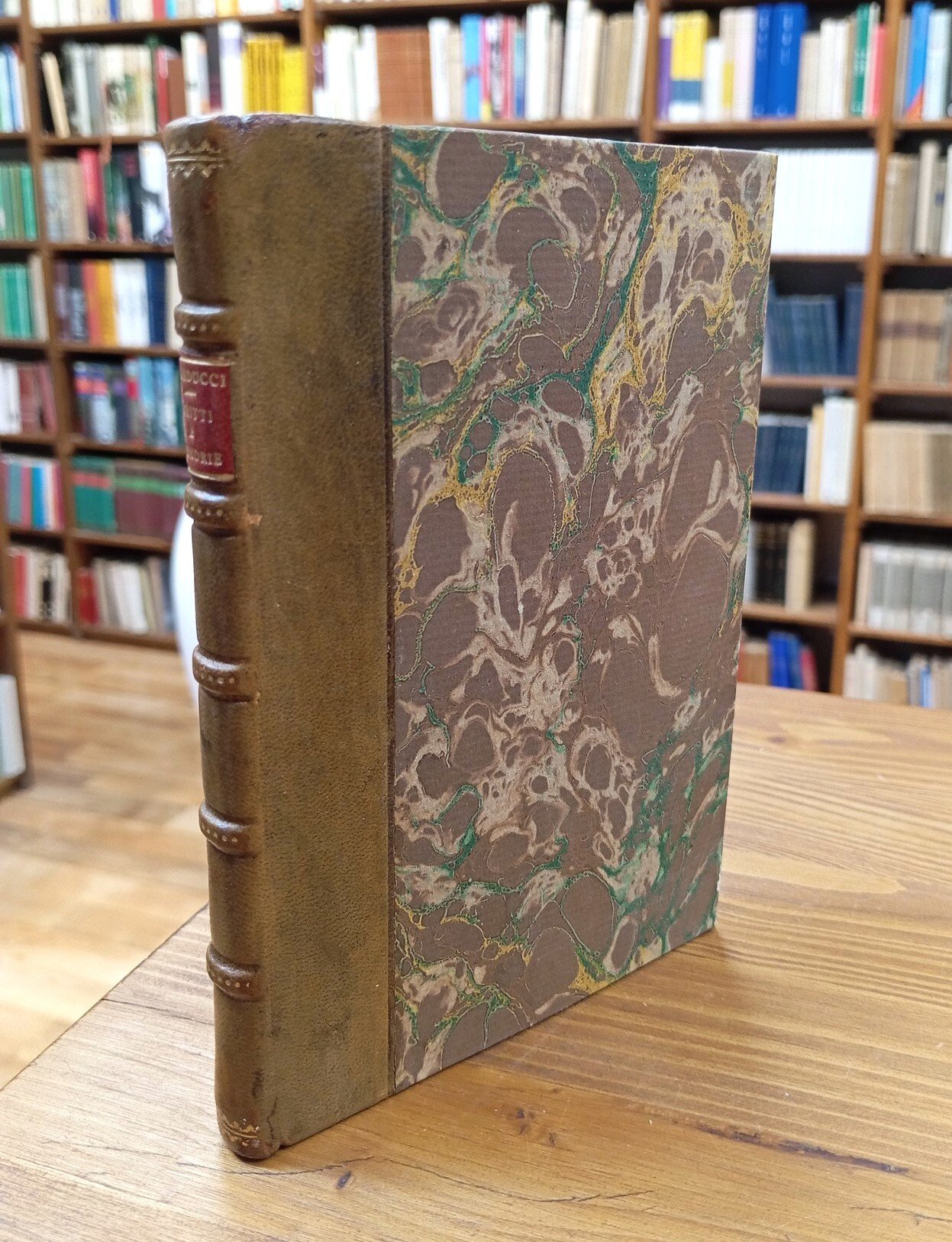 Edizione originale - Volume rilegato in solida mezza pelle marrone, titolo in oro su tassello al dorso con cinque nervature, 131 pagine con nastrino in stoffa. Conserva al suo interno i piatti della brossura originale in carta verdognola. Ordinarie bruniture alle carte per il tipo di materiale impiegato, peraltro esemplare in ottimo stato di conservazione; pubblicazione di estrema rarità, apparentemente non documentata né censita su OPAC o altri cataloghi ufficiali -- Giovanni Guarducci (1813-1863) fu sensale e capopopolo livornese vicino al Guerrazzi, combattente a Montanara, protagonista della difesa di Livorno nel 1849, capo degli esuli italiani in Corsica, volontario garibaldino e feroce critico dei primi governi post-unitari. Particolarità di questi 'scritti e memorie' è d'essere tutti composti in versi. In esergo alla raccolta, l'autore pone una accorata dedica "al mio Generale Giuseppe Garibaldi".