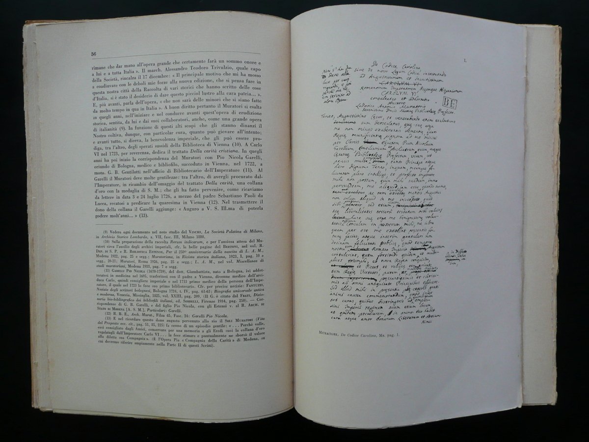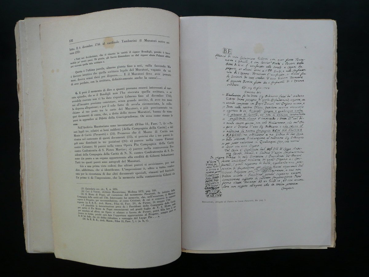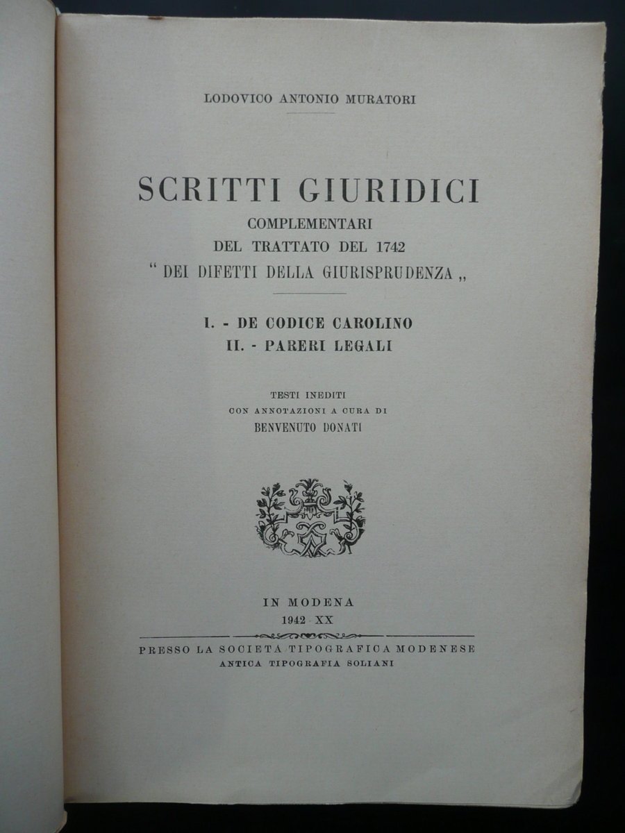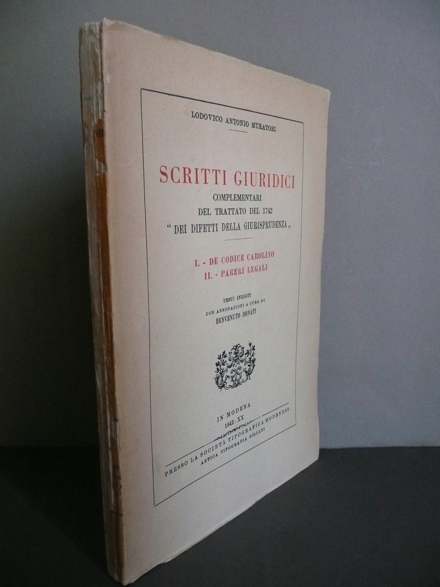 Ludovico Antonio Muratori, Scritti giuridici complementari del trattato del 1742 Dei difetti della Giurisprudenza" I. - De Codice Carolino II. - Pareri legali testi inediti con annotazioni a cura di Benvenuto Donati Società Tipografica Modenese (Antica Tipografia Soliani), Modena 1942, cm 29,5x20, pp. 168 con sette facsimili di manoscritti muratoriani f. t. (vedi foto); brossura ed. Condizioni di conservazione Esemplare in buone condizioni con tracce d'uso; angolo sup. della br. post. con un paio di piccole lievi tracce di pieghette; dorso fessurato e con alcune mancanze ma oggetto di vecchio restauro con carta giapponese, esemplare compatto. Interni buoni; fascicoli comprendenti le pp. 3-16 (tra le quali il frontespizio) staccati dal corpo del testo; margini con barbe. Esemplare raro. SETT89.L8064 N "