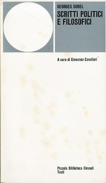 311 p. ; 18 x 10 cm. Piccola biblioteca Einaudi. Serie Testi, 11. Nell'ambito del dibattito che divide, intorno alla fine dell'Ottocento, il socialismo della Seconda Internazionale, le soluzioni teoriche proposte da Sorel rivestono un interesse assai rilevante, con echi e influenze non riducibili al complesso e contradittorio fenomeno del sorelismo. Il marxismo di Gramsci avrà infatti nella riflessione sulle opere di Sorel una delle sue fonti certe. I saggi presentati in questo volume mostrano come molti anni prima delle famose «Réflexions sur la violence», Sorel avesse originalmente individuato alcuni temi che avrebbero dominato la ricerca nel campo del marxismo e la cui profondità va oltre la teoria del sindacalismo rivoluzionario. Nello studio dei problemi giuridici ed economici appare chiaro come Sorel tenesse ben presenti le difficoltà del dilemma riforma-rivoluzione sociale, prospettando un'alternativa alle strutture politiche borghesi strettamente legata alla realtà del suo tempo. Titoli originali delle opere contenute nel volume: «Essai sur la philosophie de Proudhon»; «L'ancienne et la nouvelle méthaphysique»; «L'avenir socialiste des syndicats»; «Introduction à l'économie moderne». A cura di Giovanna Cavallari. Brossura editoriale, coperta in cartoncino flessibile plastificato opaco e colorato (b/n e grigio). Leggeri segni del tempo alla coperta, per il resto esemplare integro. Codice libreria 9465.