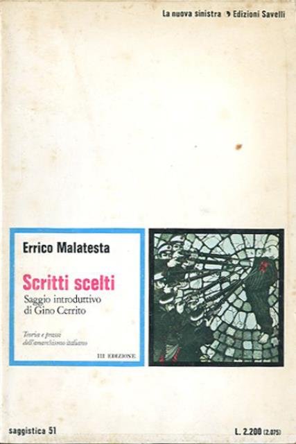 3. ed. 214 p. ; 21 x 14 cm. Saggistica, 51. Questa scelta di scritti di Errico Malatesta si propone di offrire un quadro d'insieme del pensiero del maggiore esponente dell'anarchismo italiano: pensiero originale nella sua autonomia e da Bakunin e Kropotkin, suscettibile di interpretazione attuale, contrario ad ogni dogmatica rigidità e proteso verso un'interpretazione dell'anarchismo come metodo rivoluzionario e sperimentale di vita. Saggio introduttivo di Gino Cerrito. Brossura editoriale, coperta illustrata a colori in cartoncino flessibile plastificato lucido. Qualche segno del tempo alla coperta e ai tagli (ingiallimento della carta), annotazioni ms. a penna nella prima tra pagine dell'occhietto, per il resto libro integro, da studio. Codice libreria 7736.