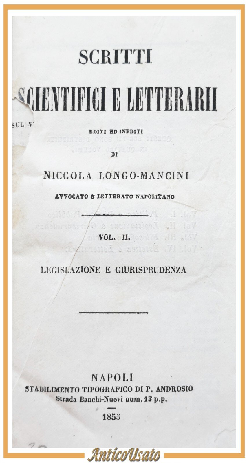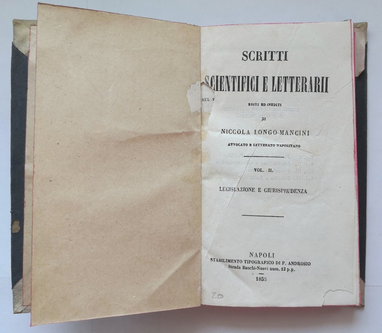 SCRITTI SCIENTIFICI E LETTERARI di Longo Mancini volume II 1855 Giurisprudenza