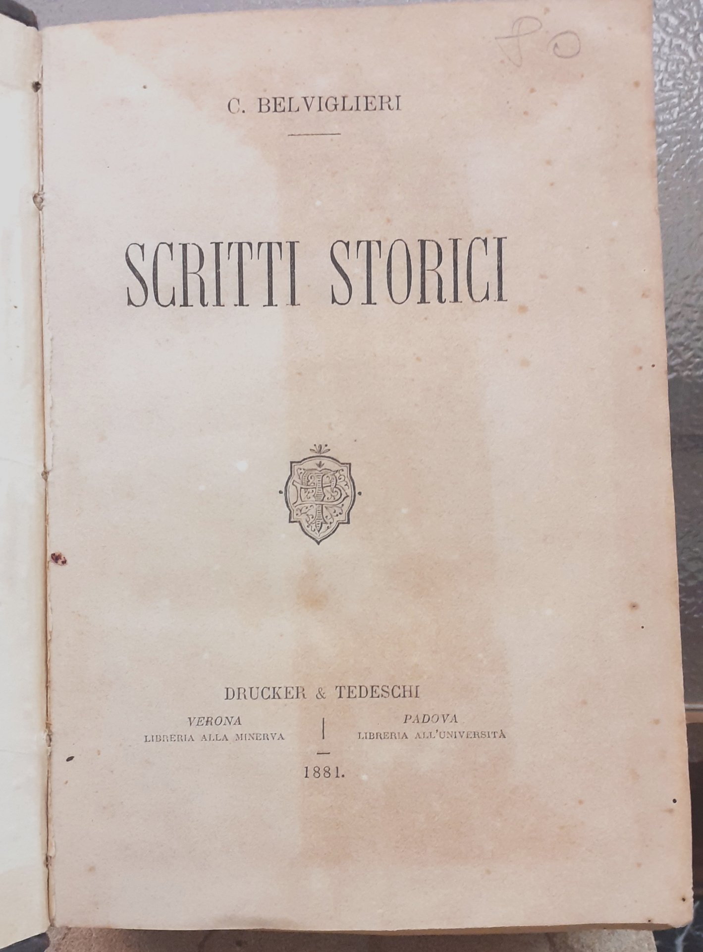 legatura coeva, dorso pelle, copp. cart. rig. edit., (Abrasioni e piccole mancanze nei fogli delle copertine). ( Indici dei contenuti nel primo volume : Sulla efficacia morale della Storia. Delle cause che nel medioevo impedirono l'unificazione politica d'Italia. La Grecia nel 1821. Dante a Verona. Le opere, la vita, i tempi di L.A. Muratori. Sulle scoperte geografiche. La Repubblica dei Romani nel medioevo. Indici del secondo volume : Delle origini italiche. Dei dialetti. Un Giusti che non è Giusti. Della Sinonimica. Il papato e il sig. Mamiani. La negromazia. Cattolicesimo e protestantismo, dimostrazione statistica, ecc.)