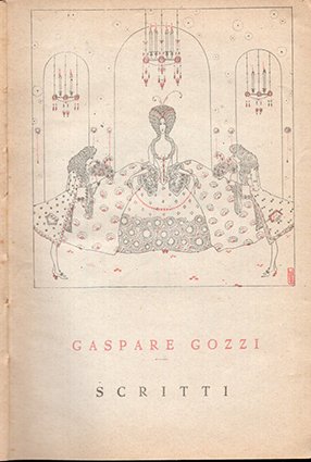 Saggio di Ippolito Pindemonte "Elogio del conte Gasparo Gozzi". Legatura in seta nera a fiori rosa, nome dell'autore a sbalzo in copertina, fregi di Duilio Cambellotti