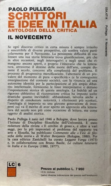 Soggetti: Critica letteraria, Letteratura contemporanea italiana, Antologie critiche, Scrittori, Autori italiani, Novecento, Ventesimo secolo, Opere, Narrativa, Prosa, Drammaturgia, Teatro, Poesia, Poetica, Correnti letterarie, Movimenti, Avanguardia, Futurismo, Fascismo, Decadentismo, Verismo, Realismo, Neorealismo, Simbolismo, Guerre Mondiali, Borghesia, Società, Psicanalisi, Psicologia, Linguaggio, Storia, Cultura, Testi scelti, Descrizioni, Studi culturali, Libri Vintage, Fuori catalogo, Forme letterarie, Italia, Giovanni Pascoli, Luigi Pirandello, Giovanni Verga, Luigi Capuana, Benedetto Croce, Francesco De Sanctis, Antonio Gramsci, Sinistra, Intellettuali, Marxismo, Comunismo, Socialismo, Contini, Poesie, Minori, Coscienza di Zeno, Grandi Romanzi, Filosofia, Pierpaolo Pasolini, Dibattiti, Polemiche, Giornali, Produzione, Fruizione, Lettura, Lettori, Alienazione, Modernità, Bonfiglioli, D'Annunzio, Vate, Ideologie politiche, Superuomo, Salinari, Jacomuzzi, Noferi, Briganti, Castronovo, Strappini, Vasoli, Ragionieri, Frigessi, Impegno civile, Stampa, Editoria, Industria, Riviste, Nazionalismo, Stile, Alcyone, Anceschi, Spagnoletti, Tessari, Soffici, Calvesi, De Maria, Anarchici, Palazzeschi, Dialettale, Ironia, Corazzini, Gozzano, Govoni, Tecnica, Macchina, Mito, Anni Sessanta, Sperimentalismo, Novissimi, Scalia, Giuliani, Agosti, Zanzotto, Cases, Calvino, Barberi Squarotti, Eugenio Garin, Norberto Bobbio, Alberto Asor Rosa, Umberto Eco, Fernandez, Populismo, Politecnico, Ronda, Saba, Cardarelli, Napoletani, Saccenti, Bacchelli, De Benedetti, Ferrata, Critici, Giovani, Ossi di seppia, Raccolte, La Penna, Moravia, Indifferenti, Carlo Emilio Gadda, Romanesco, Pouillon, Rebora, Dino Campana, Fergusson, Palcoscenico, Boine, Voce, Slapater, Cattaneo, Raimondi, Renato Serra, Carlo Michelstaedter, Sbarbaro, Coscienza, Banfi, Bigongiari, Emilio Cecchi, Capitalismo, Unità, Unificazione, Sud, Literary Criticism, Italian Contemporary Literature, Critical Anthologies, Writers, Italian Authors, Twentieth Century, Works, Fiction, Prose, Drama, Theater, Poetry, Poetics, Literary Currents, Movements, Avant-garde, Futurism, Fascism, Decadence, Neorealism, Symbolism, World Wars, Bourgeoisie, Society, Psychoanalysis, Psychology, Language, History, Culture, Selected Texts, Descriptions, Cultural Studies, Books out of print, Literary forms, Italy, Left, Intellectuals, Communism, Socialism, Poems, Great Novels, Philosophy, Debates, Controversies, Newspapers, Production, Exploitation, Reading, Readers, Alienation, Modernity, Political Ideologies, Superman, Civil Engagement, Press, Publishing, Industry, Magazines, Nationalism, Style, Anarchists, Dialect, Irony, Technique, Myth, Sixties, Experimentalism, Novissimi, Populism, Polytechnic, Neapolitans, Critics, Youth, Collections, Unity, Unification, South