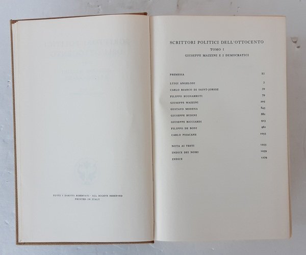 Ottavo (23 x 14,5 cm). XV, 1283 p. Legatura editoriale in tutta tela con titolo in oro al dorso su tassello rosso, con segnacolo. In buono stato di conservazione. Tomo I, curato da Franco Della Peruta riguardante Giuseppe Mazzini ed i Democratici. Collana diretta da Raffaele Mattioli, Pietro Pancrazi, Alfredo Schiaffini.