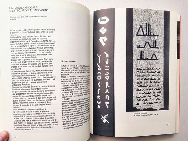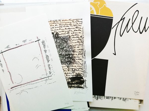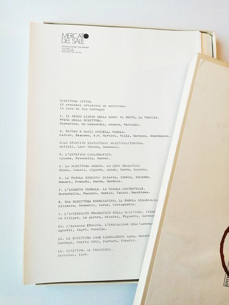 Scatola di cm. 34X24,5 che contiene 50 opere originali di grafica di Artisti diversi, una raccolta con tiratura di soli 100 esemplari, ciascuna opera grafica numerata e firmata a mano da ogni autore. Questa copia è siglata 7/100 ed è in condizioni perfette. Le opere sono suddivise in 12 argomenti - Il segno libero della mano -, con Scanavino, De Leonardis, Arosio. Pericoli. - Pathos e 6 magia d(n)ella parola - con Caruso, Diacono, S.M.Martini, Villa, Marocco, Brandolini. - Lo spartito sintattico - con Belloli ,Lora Totino, Nannucci. - L estetico calligrafico - con Accame, Pavanello, Sanesi. - La scrittura negata - con Blank, Comini, Algardi, Danon, Xerra, Spatola. - La parola giocata - con Munari, Franchi, Dorna, Mondino. - L inserto verbale - con Baruchello, Pozzati ,Mussio, Radini, Macchione. - Una scrittura enunciativa - con Altamira, Brunetti, Carpi, Castagnotto. - L intervento pragmatico sulla scrittura - con De Filippi, La Pietra, Miccini, Pignotti, Sarenco, D Ottavi. - L assenza evocata - con Agnetti, Isgro, Patella . - La scrittura come linguaggio - con Carrega, Oberto(OM), Ferrari, Finotti, - Scrittura al femminile - con Niccolai e Izzo. Opera di eccezionale originalita editoriale pubblicata in occasione della Mostra svoltasi presso il Centro Culturale - Randottanta - a Sesto San Giovanni dal 26 settembre al 18 ottobre 1980